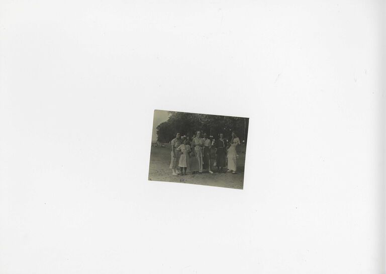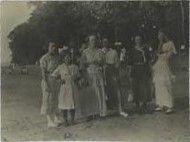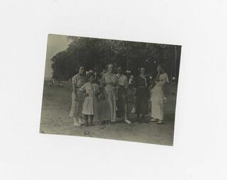 Black and white photograph of a group of people. The person second to the left is identified as Lib Shaw.