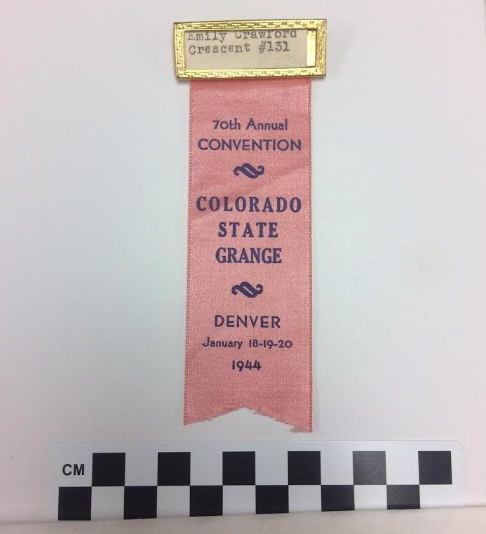 This is a nametag from the Colorado State Grange 70th Annual Convention in 1944. There is a pink ribbon attached to the nametag with blue text about the event. The nametage is gold in color with a piece of paper inside of it. The paper reads, "Emily Crawford/ Crescent #131". The nametag measures 2" (w) x 5.5" (l) all together.