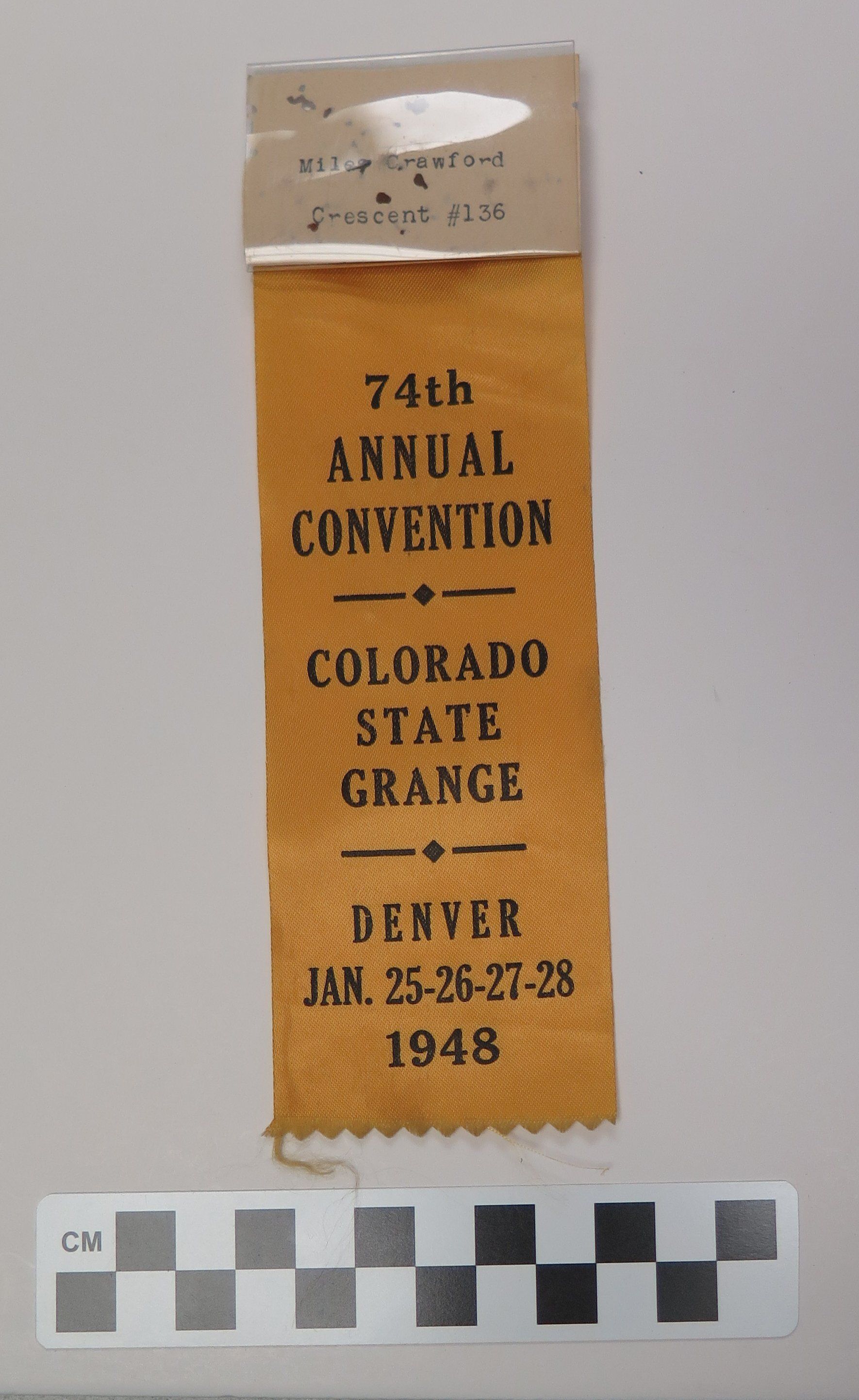 This is a nametag with a yellow ribbon attached to it. The nametag is made of a piece of plastic with a piece of paper inside it. The paper reads, "Miles Crawford/ Crescent #136". The ribbon has black text that reads, "74th/ Annual/ Convention/ Colorado/ State/ Grange/ Jan. 25-26-27-28/ 1948". The nametag and ribbon measure 2.5" (w) x 8" (l) together.