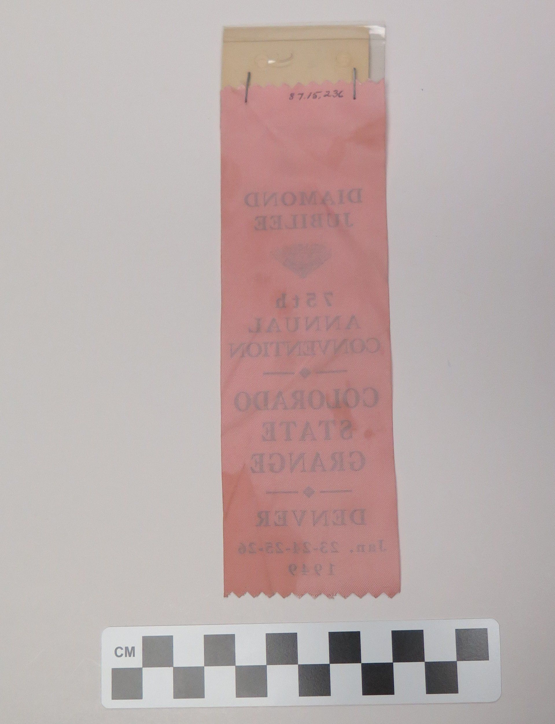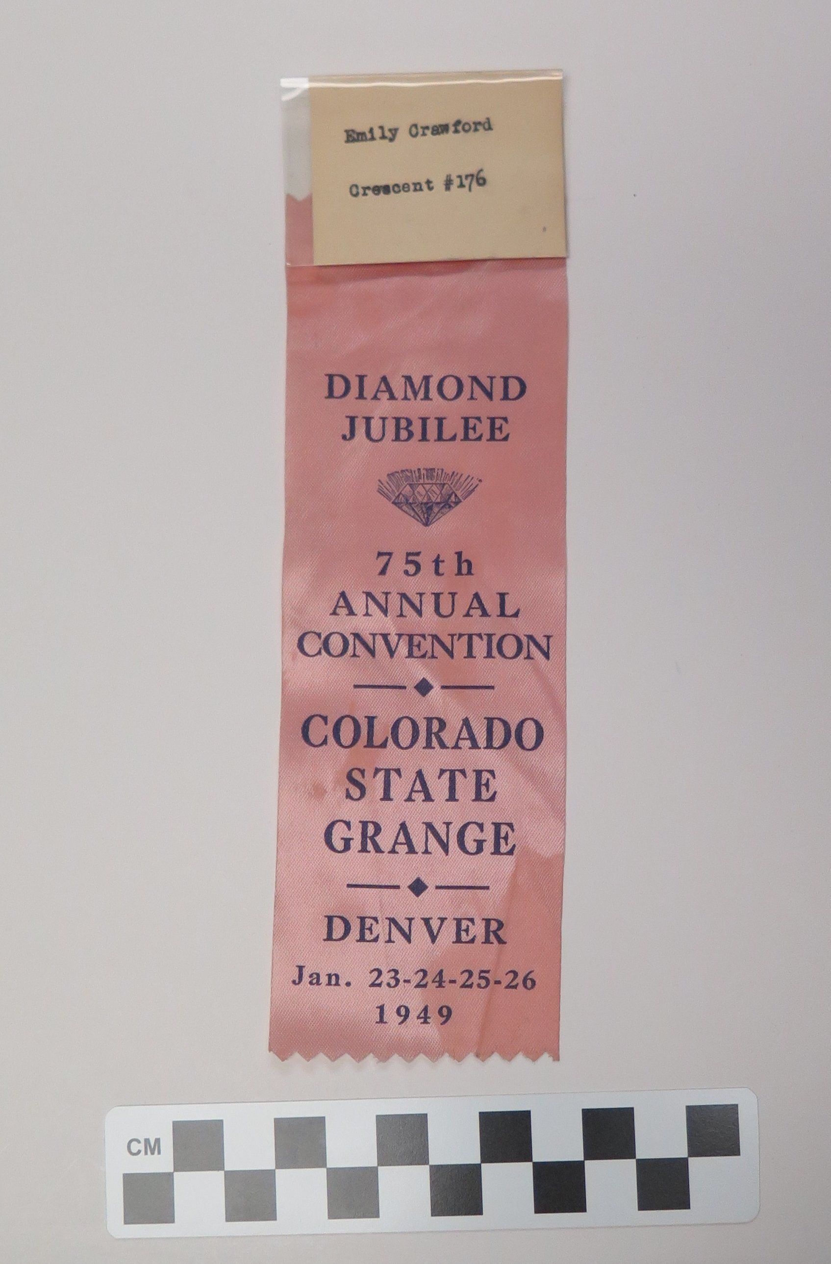 This is a nametag with a pink ribbon attached. The nametag is made of a piece of plastic with a piece of paper inside of it. The paper reads, "Emily Crawford/ Crescent #176". The ribbon has blue text that reads, "Diamond/ Jubilee/ 75th/ Annual/ Convention/ Colorado/ State/ Grange/ Denver/ Jan. 23-24-25-26/ 1949". The ribbon measures 2.5" (w) x 6" (l).