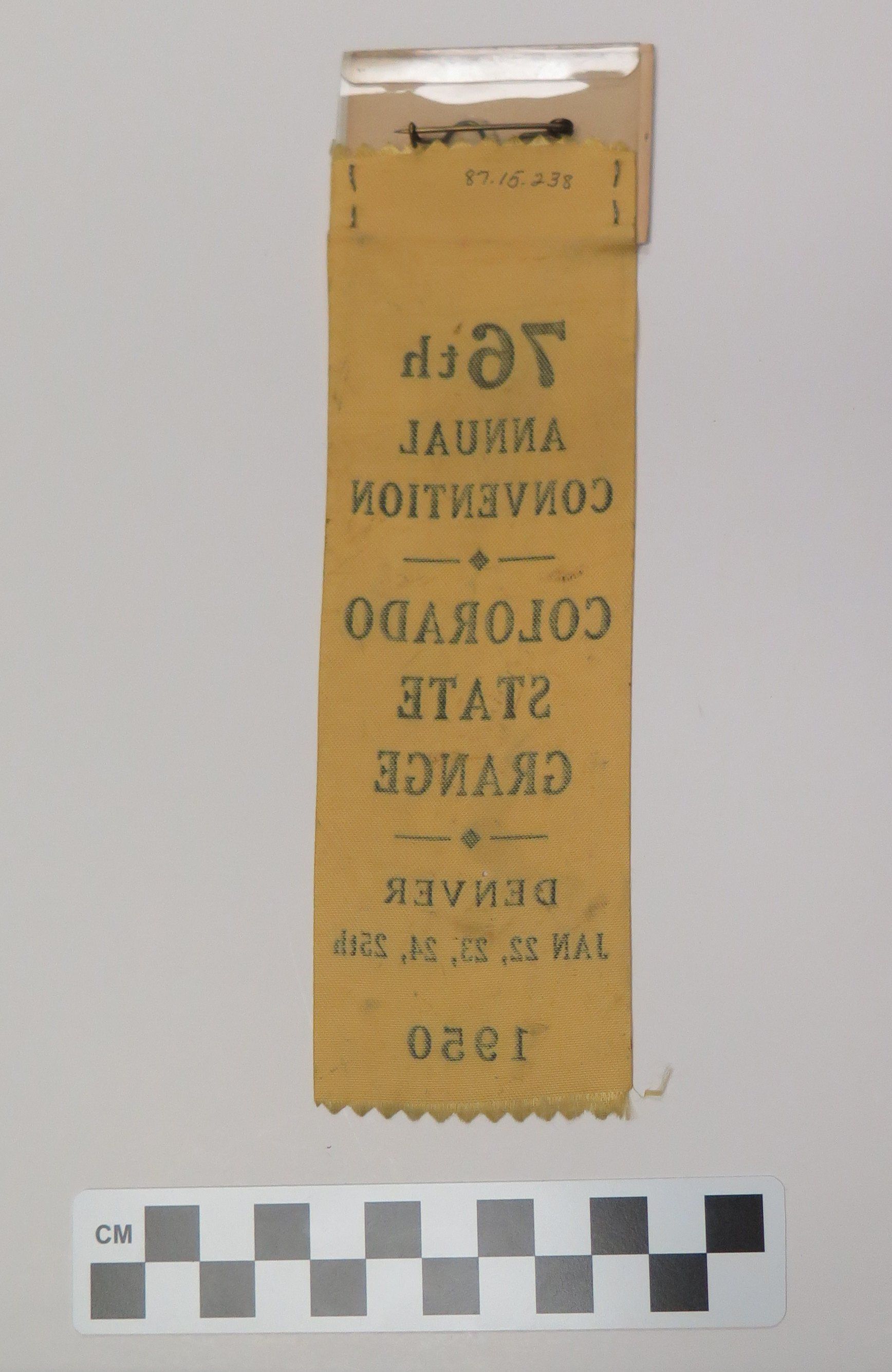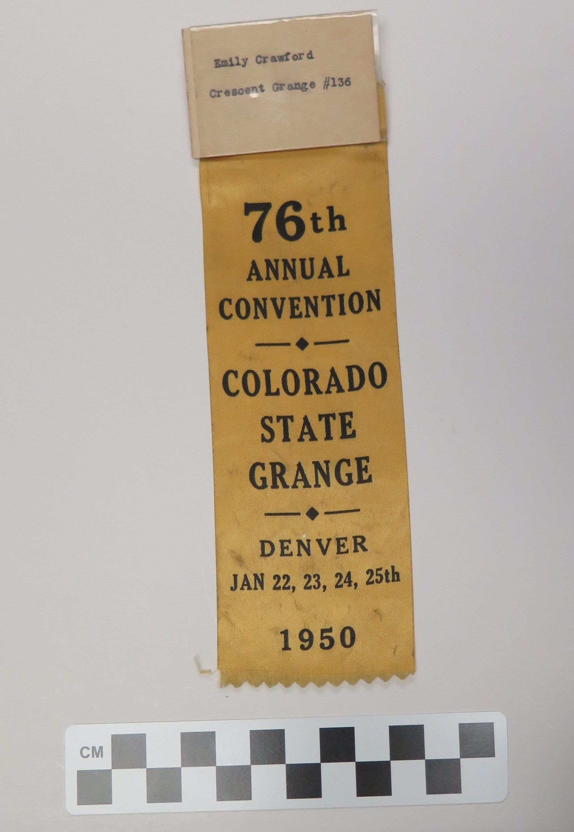 This is a nametag with a yellow ribbon attached. The nametag is made of a plastic sleeve with a piece of paper inside of it. The paper reads, "Emily Crawford/ Crescent Grange #136". The ribbon has black text that reads, "76th/ Annual/ Convention/ Colorado/ State/ Grange/ Denver Jan 22-23-24-25th/ 1950". The nametag and ribbon measure 2.5" (w) x 8" (l) together.