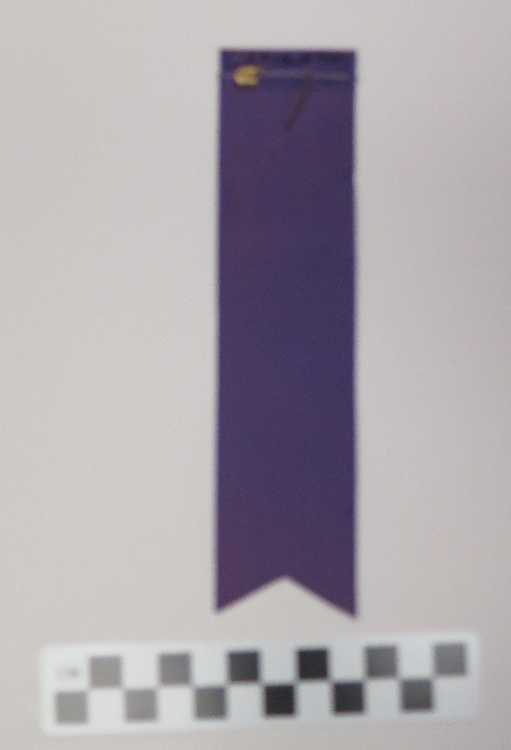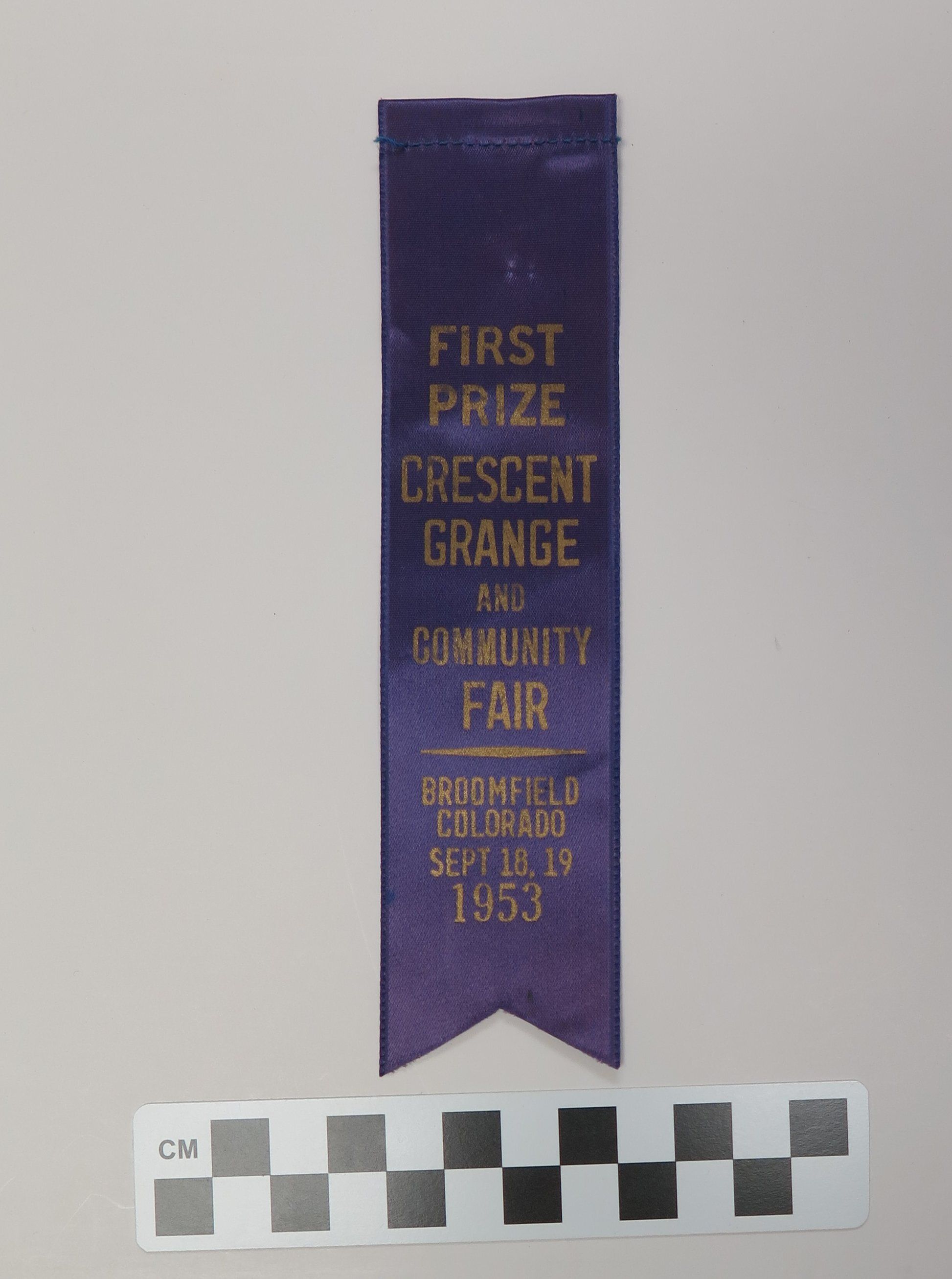 This is a blue prize ribbon for first place. The ribbon has gold text on the front that reads, "First/ Prize/ Crescent/ Grange/ and/ Community/ Fair/ Broomfield/ Colorado/ Sept 18-19/ 1953". The ribbon measures 1.5" (w) x 6.5" (l).