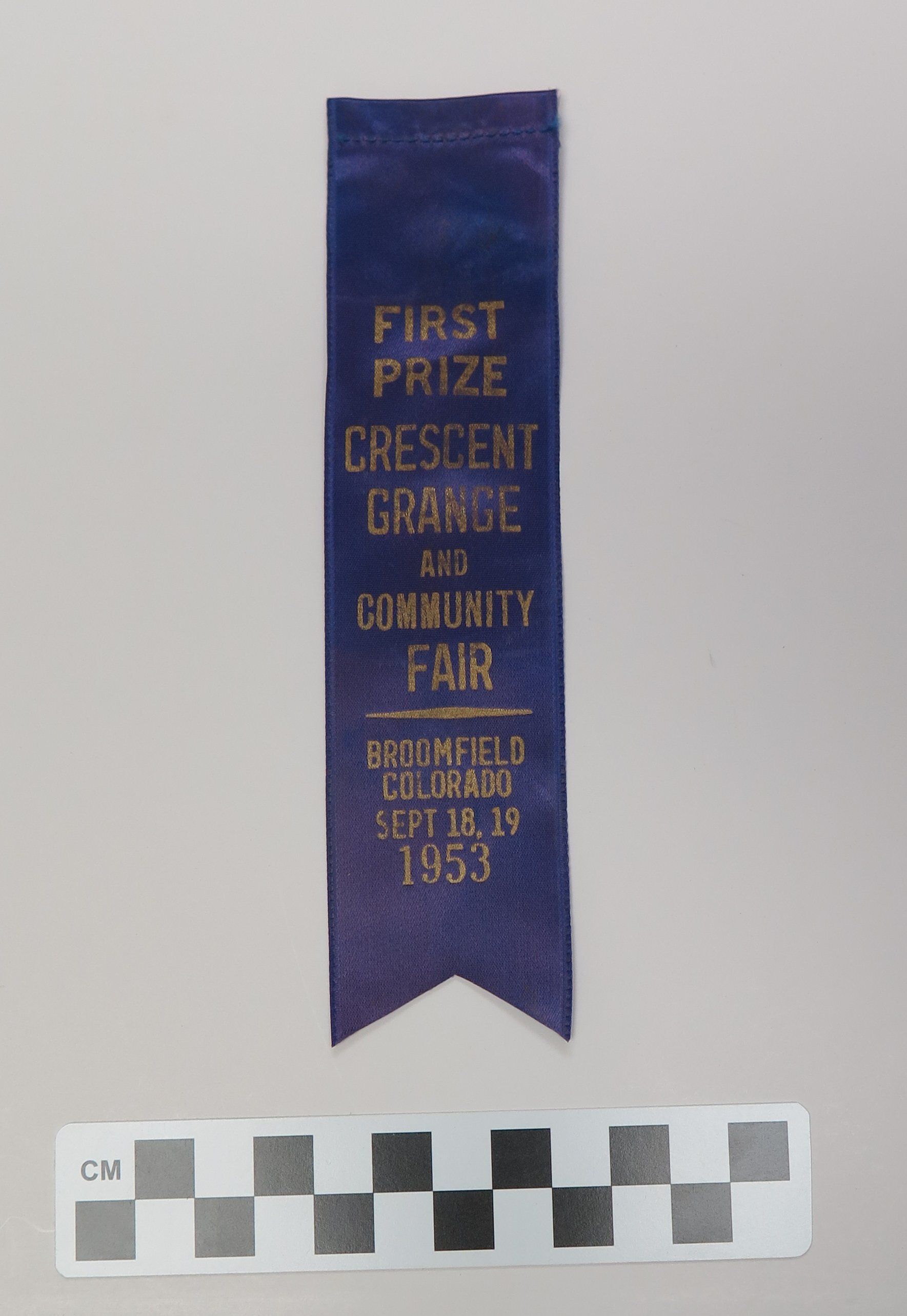 This is a blue prize ribbon for first place. The ribbon has gold text on the front that reads, "First/ Prize/ Crescent/ Grange/ and/ Community/ Fair/ Broomfield/ Colorado/ Sept 18-19/ 1953". The ribbon measures 1.5" (w) x 6.5" (l).