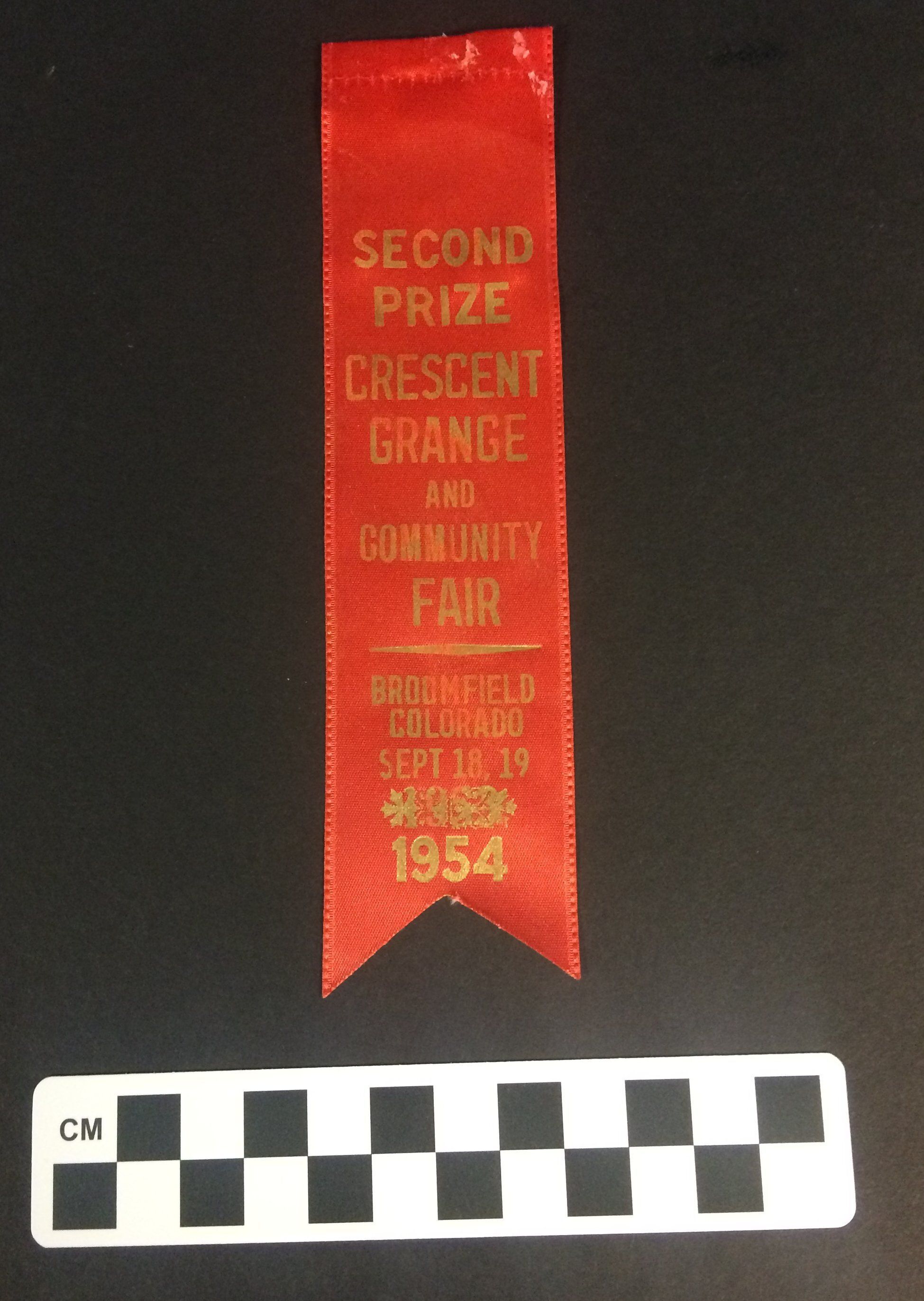 This is an red ribbon award that has faded. The top is hemmed and there is a safety pin on the back. The text is gold and reads, "Second Prize Crescent Grange and Community Fair, Broomfield Colorado, Sept. 18,19,1954. The ribbon measures 6.5" (h) x 1.5" (w).Collection