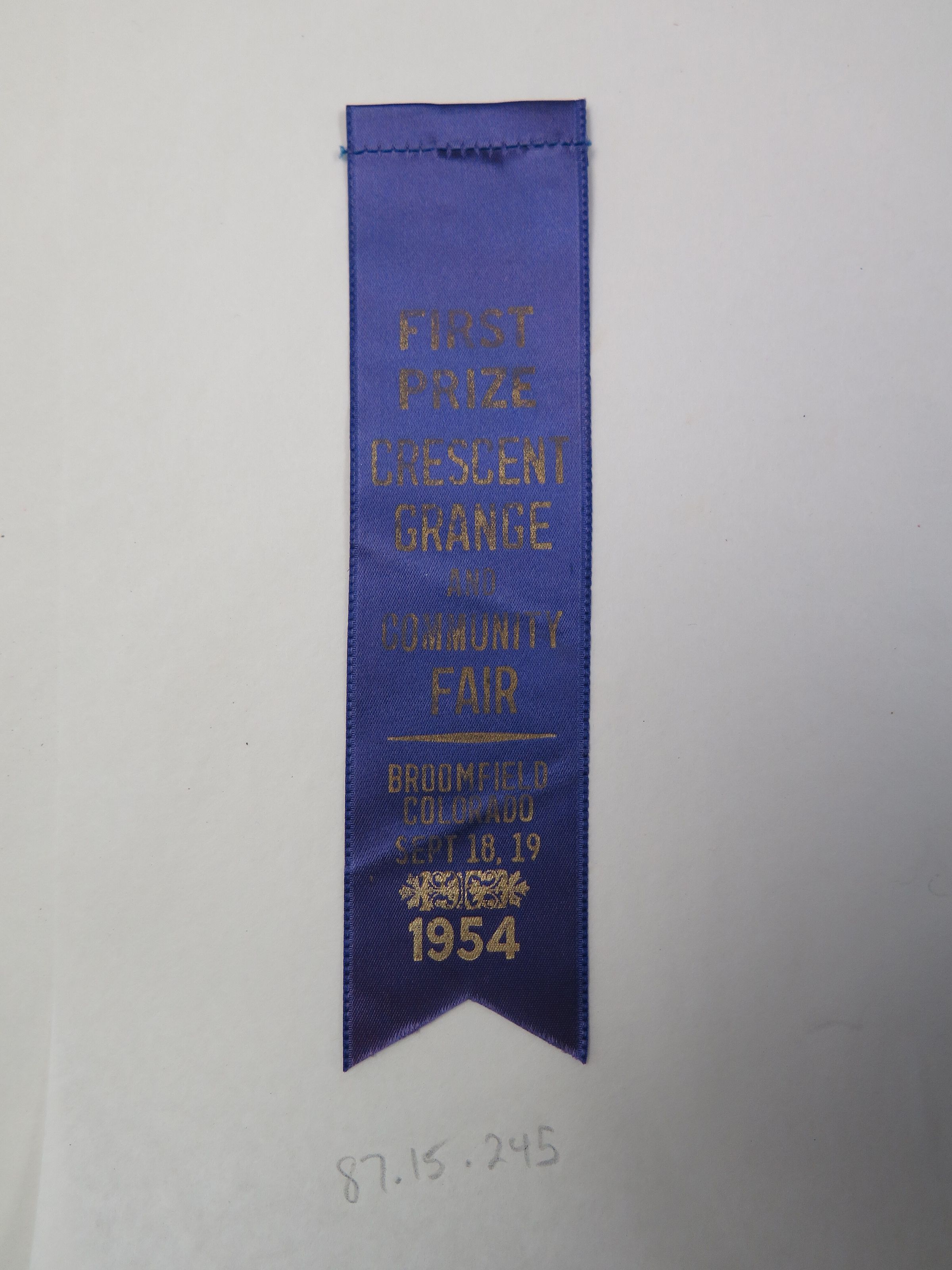 This is a blue prize ribbon for first place. The ribbon has gold text on the front that reads, "First/ Prize/ Crescent/ Grange/ and/ Community/ Fair/ Broomfield/ Colorado/ Sept 18-19/ 1954". The ribbon measures 1.5" (w) x 6.5" (l).