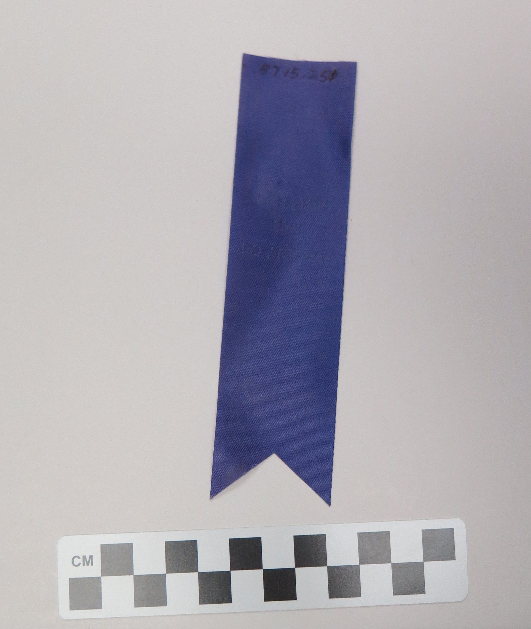 This is a blue first prize ribbon from the Broomfield Hobby Show in 1965. The ribbon measures 1.5" (w) x 5.75" (l).