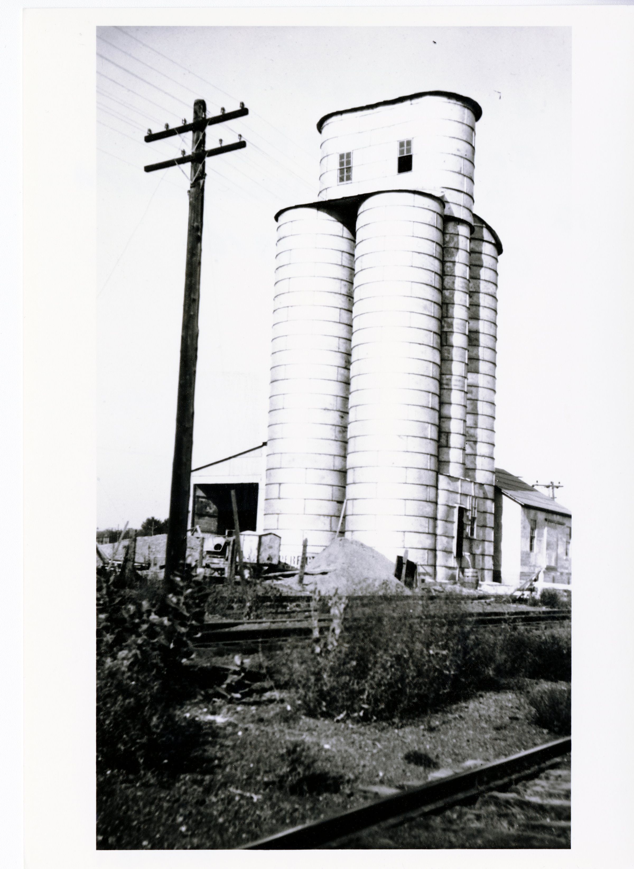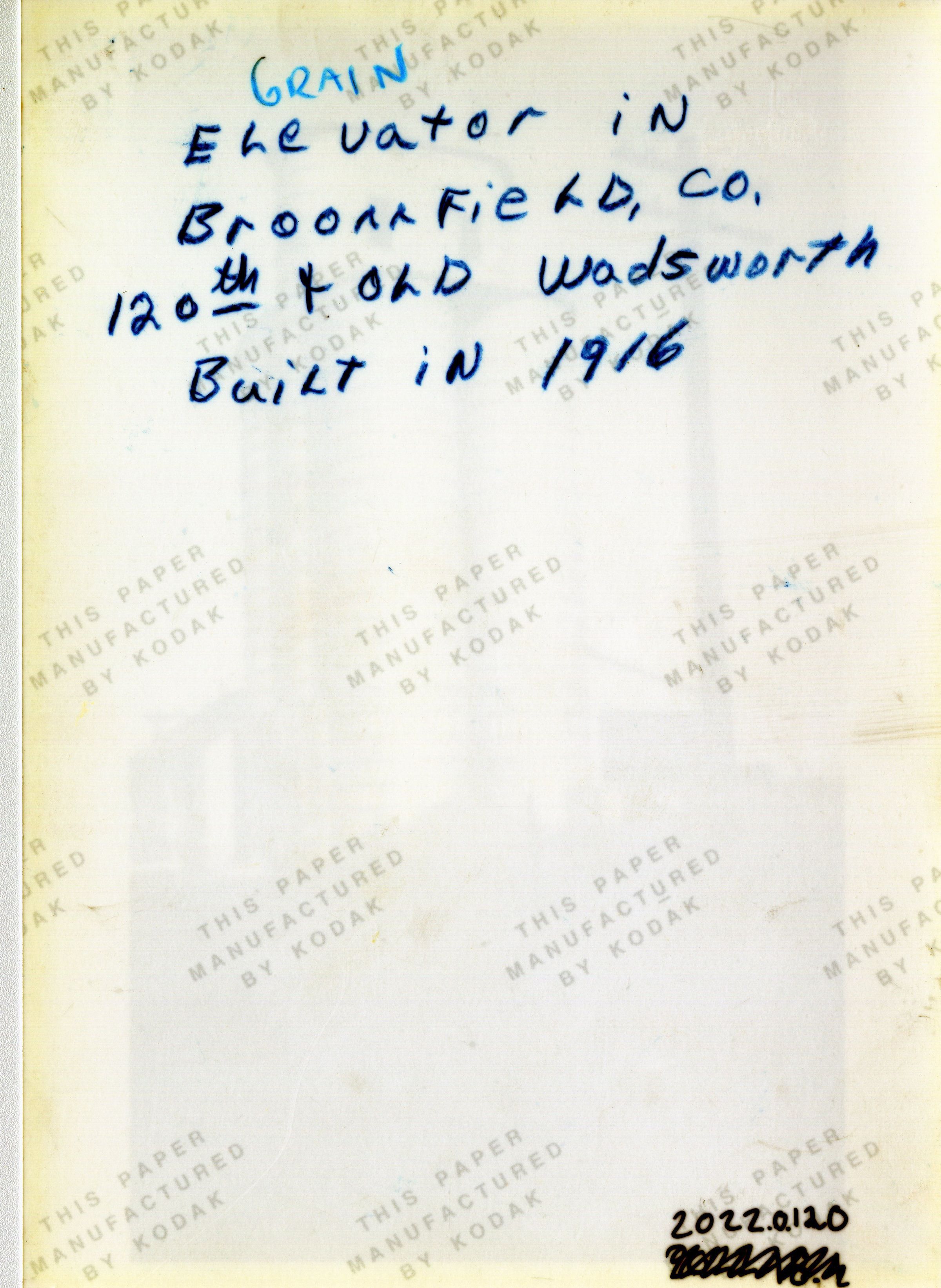 A black and white photo of the steel grain elevator in 120th in Wadsworth, Broomfield CO. With part of the railroad in the foreground. Elevator built in 1916, date of photograph is unknownCollection