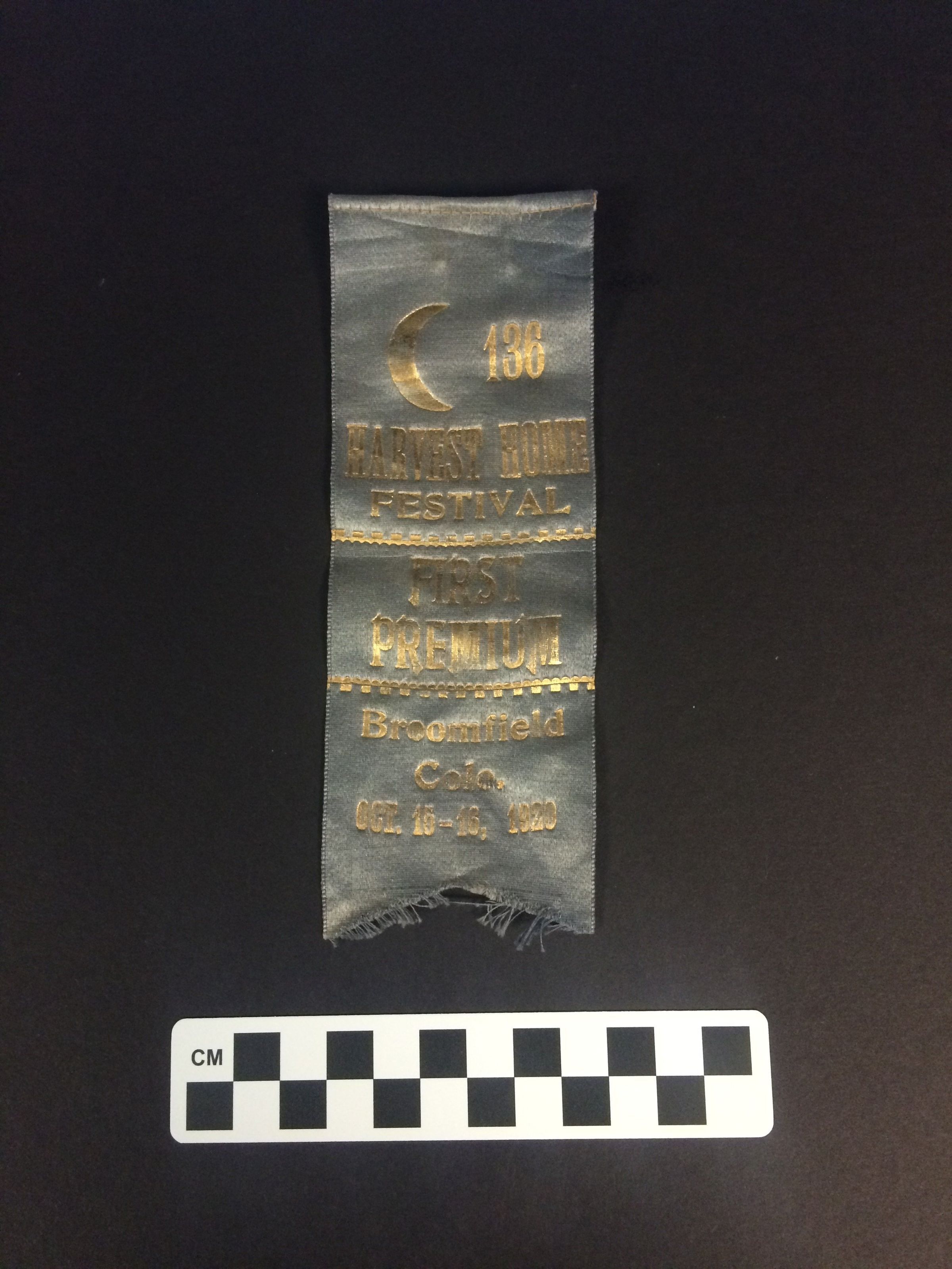 This blue ribbon has a crescent moon and text in gold, "136/Harvest Home Festival/ First Premium/Broomfield Colo./ Oct. 15-16, 1920." The ribbon has faded. The ribbon measures 2.25" (w) x 6.5" (l).Collection