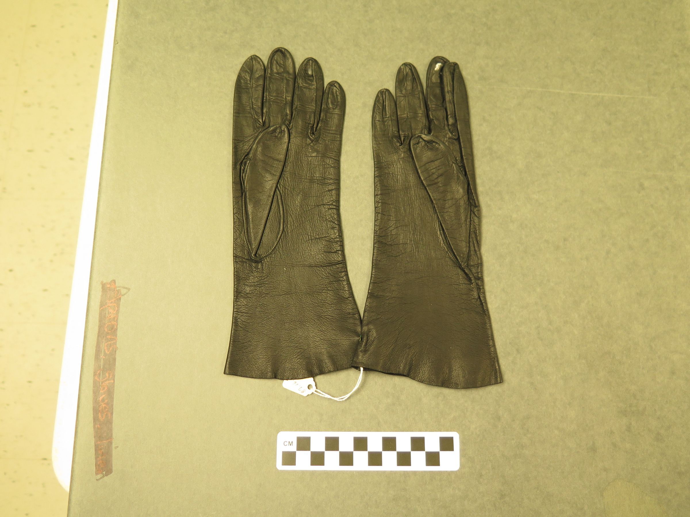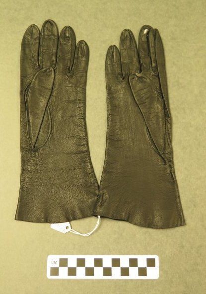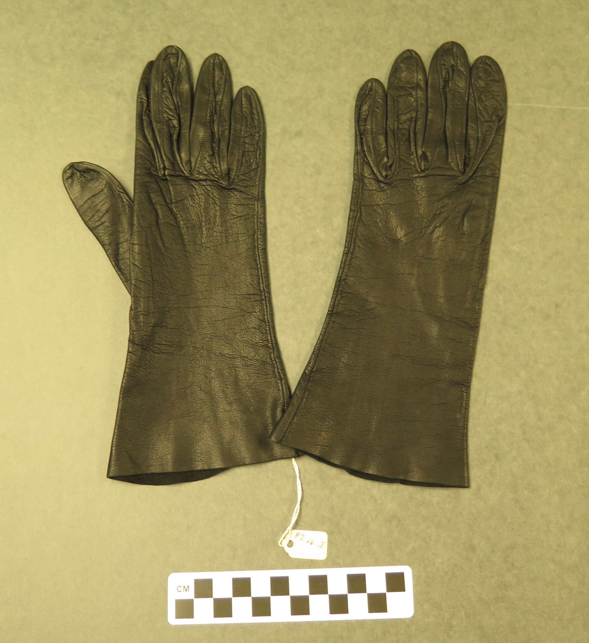 This is a pair of black leather ladies gloves. There is a white residue on the middle finger of the right glove. Gloves measure 4" (w) x 11" (l).