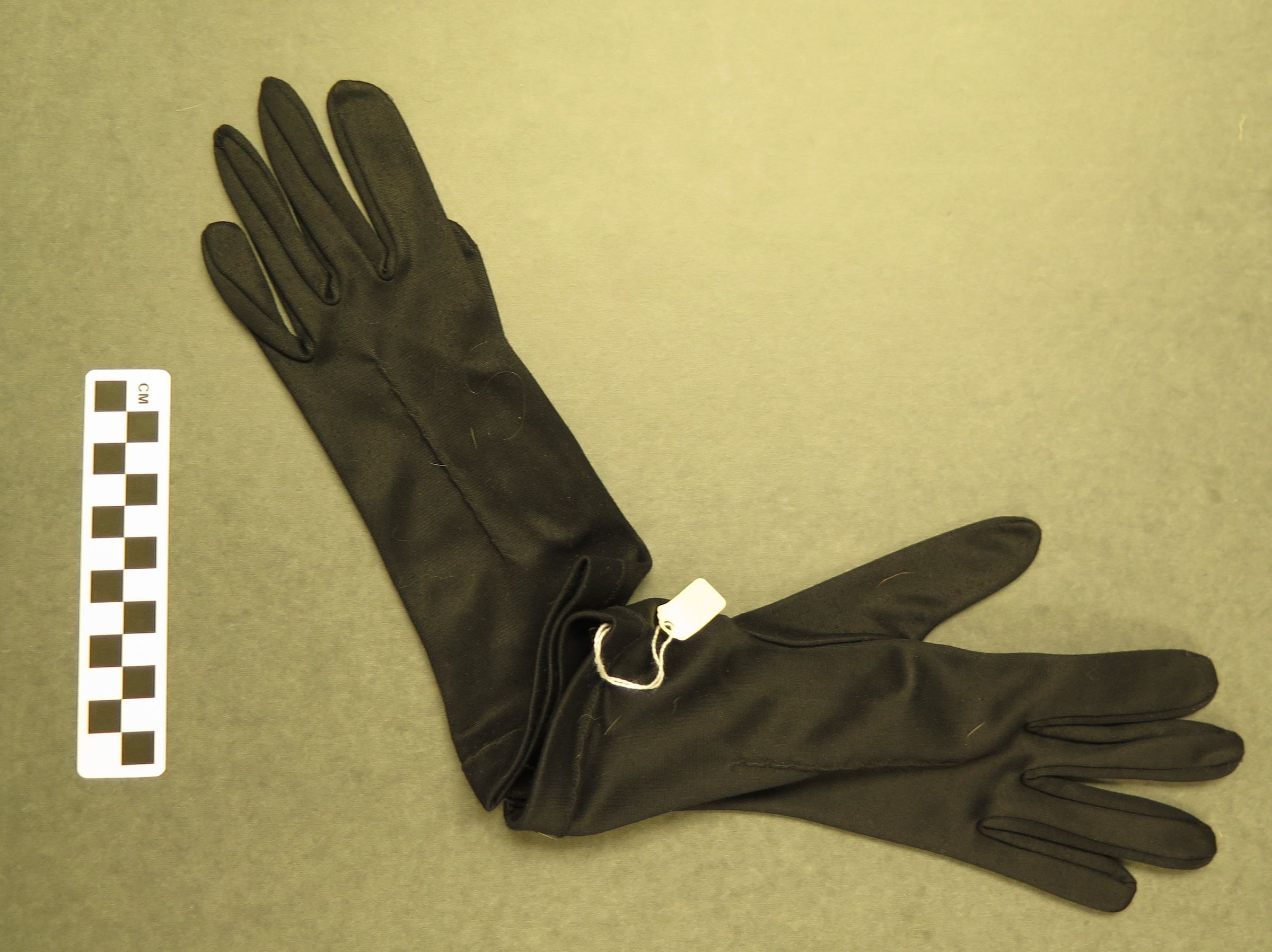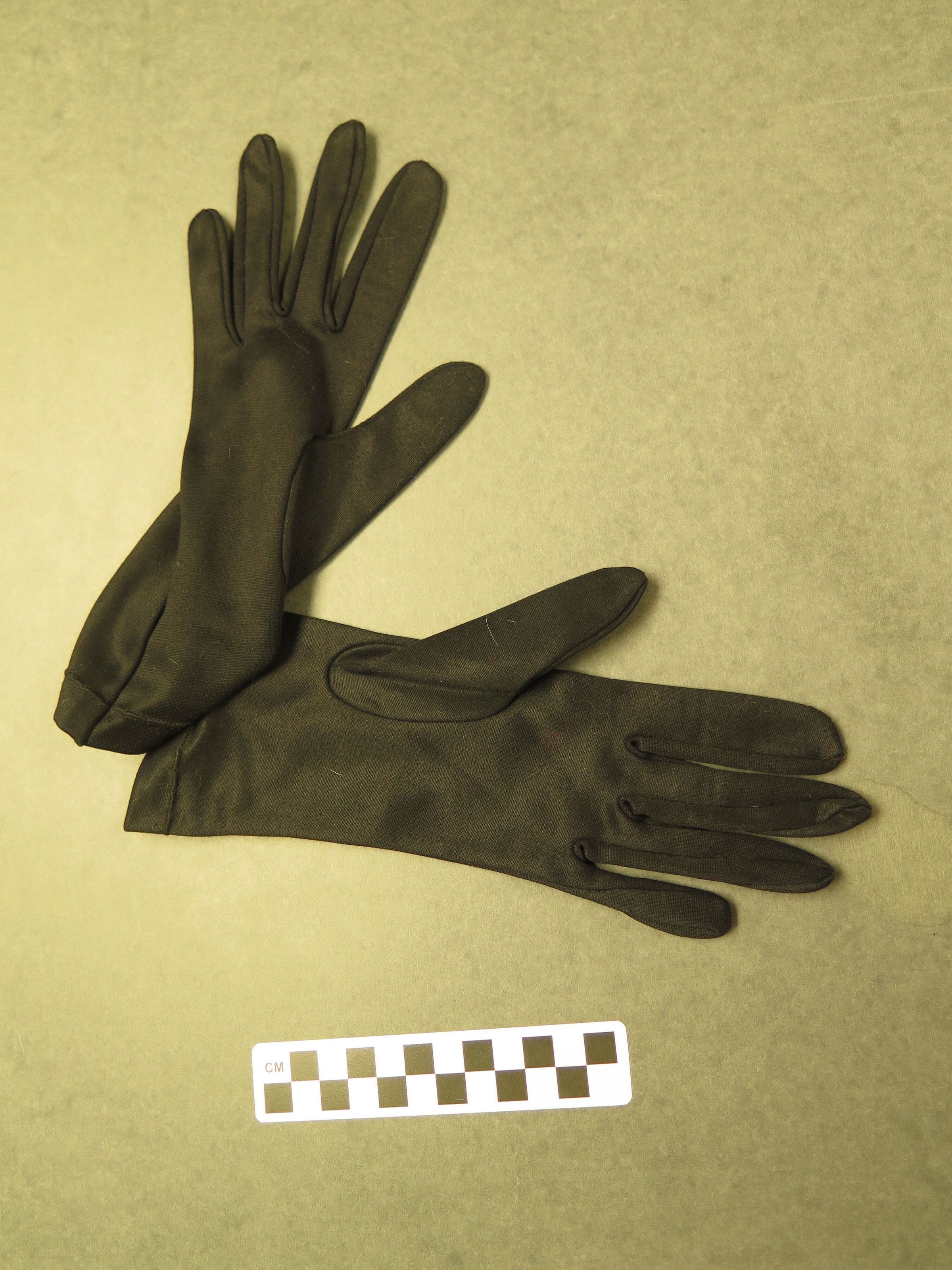 This is a pair of black St. Michael brand cloth ladies gloves in size medium. The gloves are made of Bri-Nylon The gloves have a single line down the back of the hand. Each glove measures 5" (w) x 3" (l).