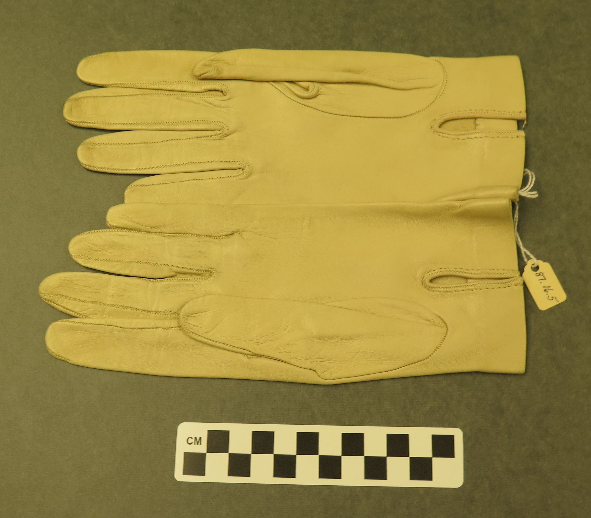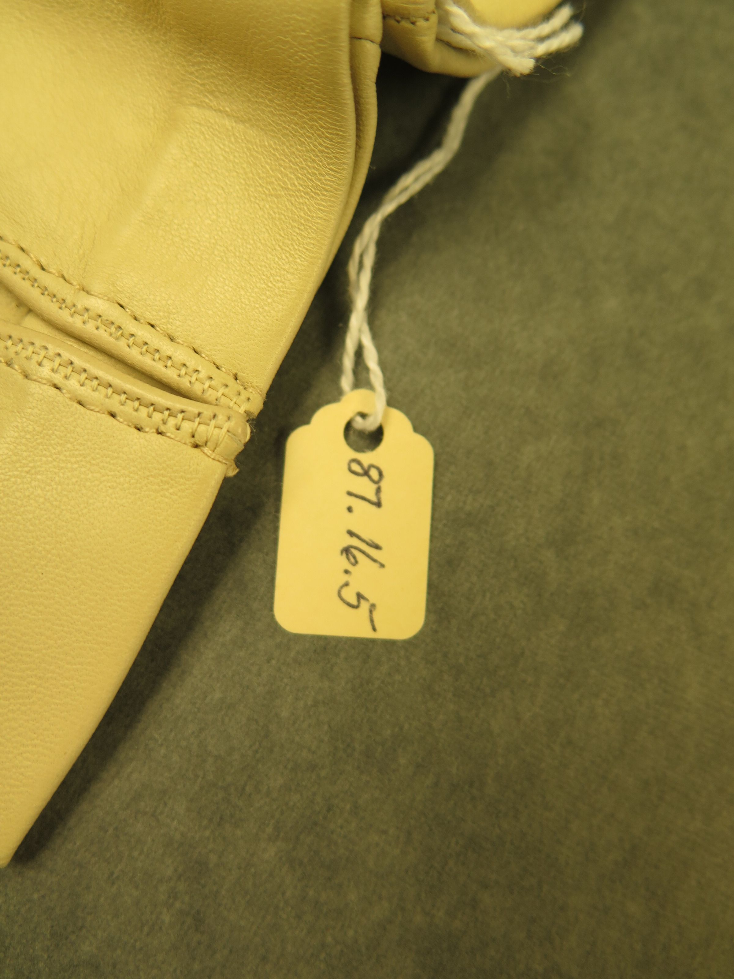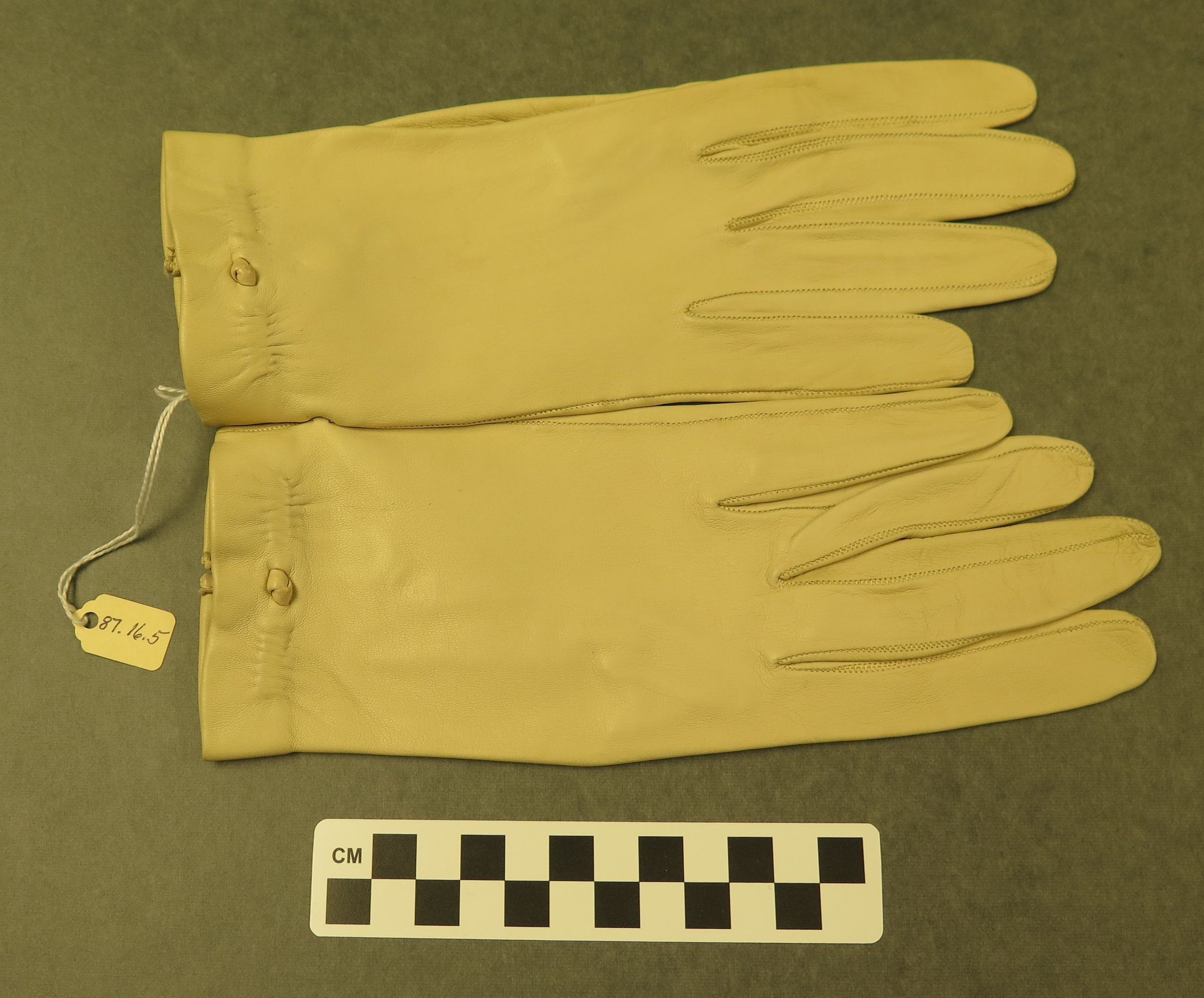 This is a pair of beige leather ladies gloves. There is a knot of leather to keep the gloves tight at the wrist. There is a slit at the inside of the wrist on both gloves. Gloves measure 4" (w) x 6" (l).