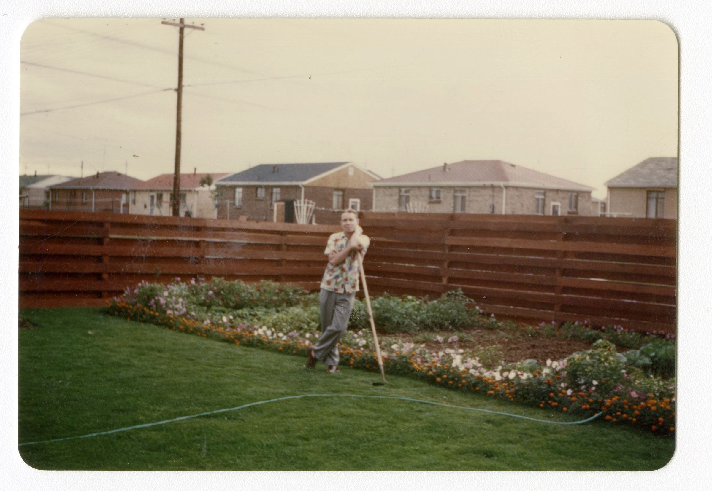 Color photograph of one of the Brunners in a yard. The house is along Midway. The person is likely either Lester C or Lester K.