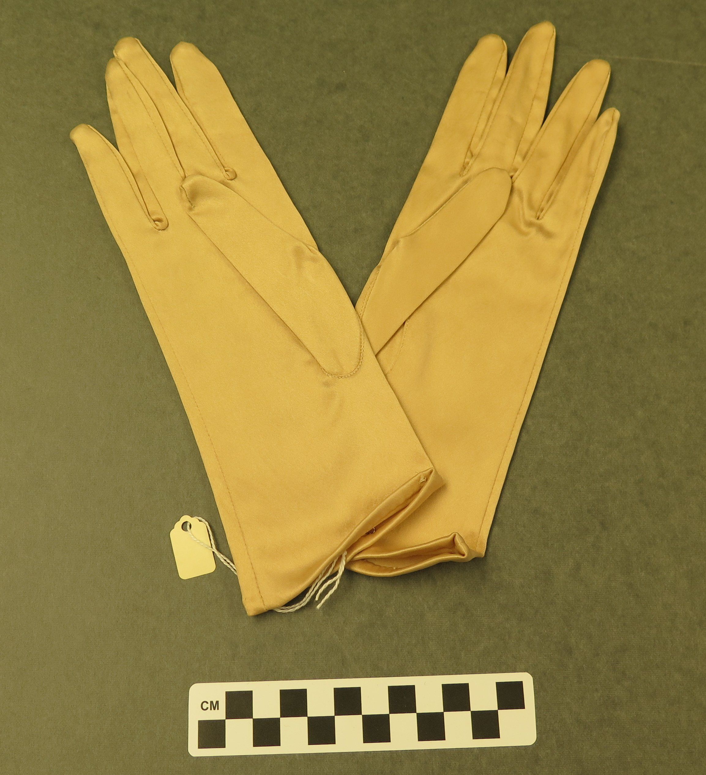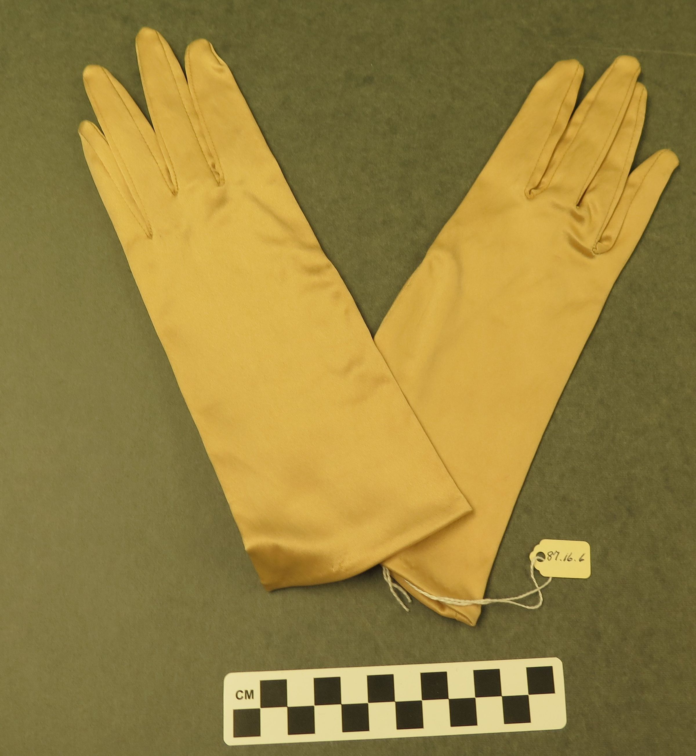 This is a pair of beige colored satin ladies gloves. Gloves measure 7.5" (w) x 3.5" (l)