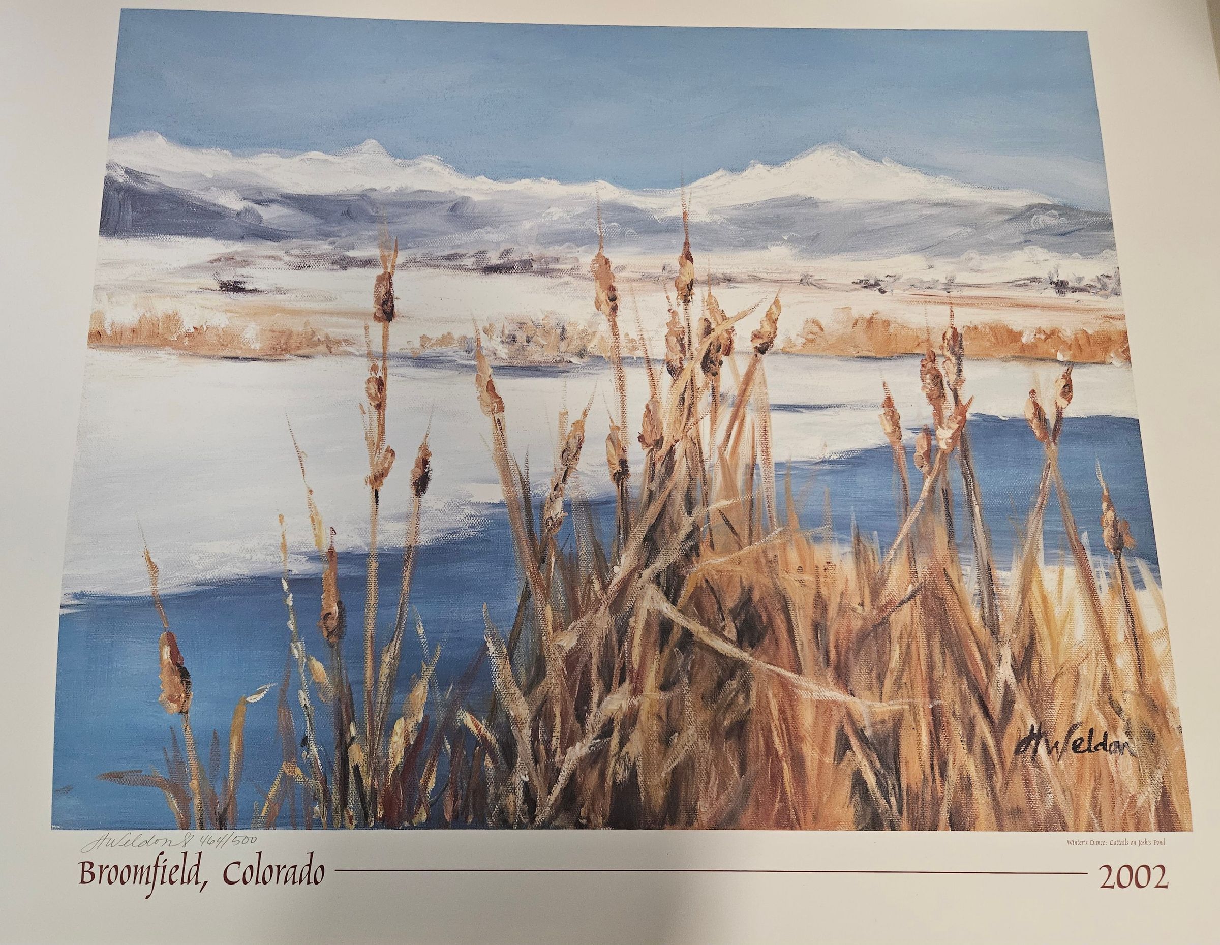 Item is a poster created for the 2002 Broomfield Days event. The poster features the painted image of a snowy plain next to a river, with the foreground and background framed by browning cattails and frosted mountains, respectively. Below the image, which is titled "Winter's Dance: Cattails on Josh's Pond," the artist, H. Weldon, had signed the poster and indicated that this is the 464th out of the 500 posters distributed. The red text below the image reads "Broomfield, Colorado, 2002."Collection