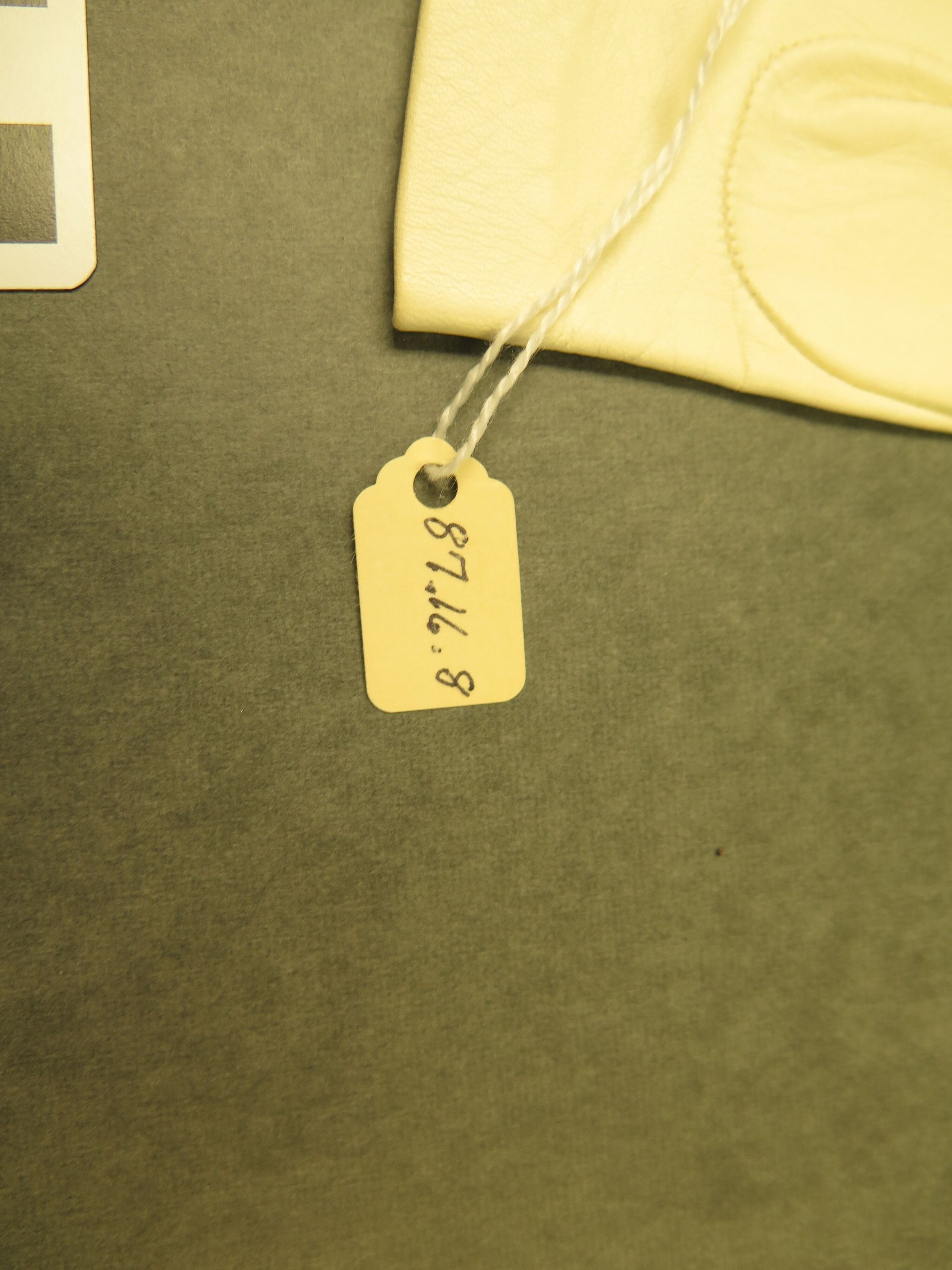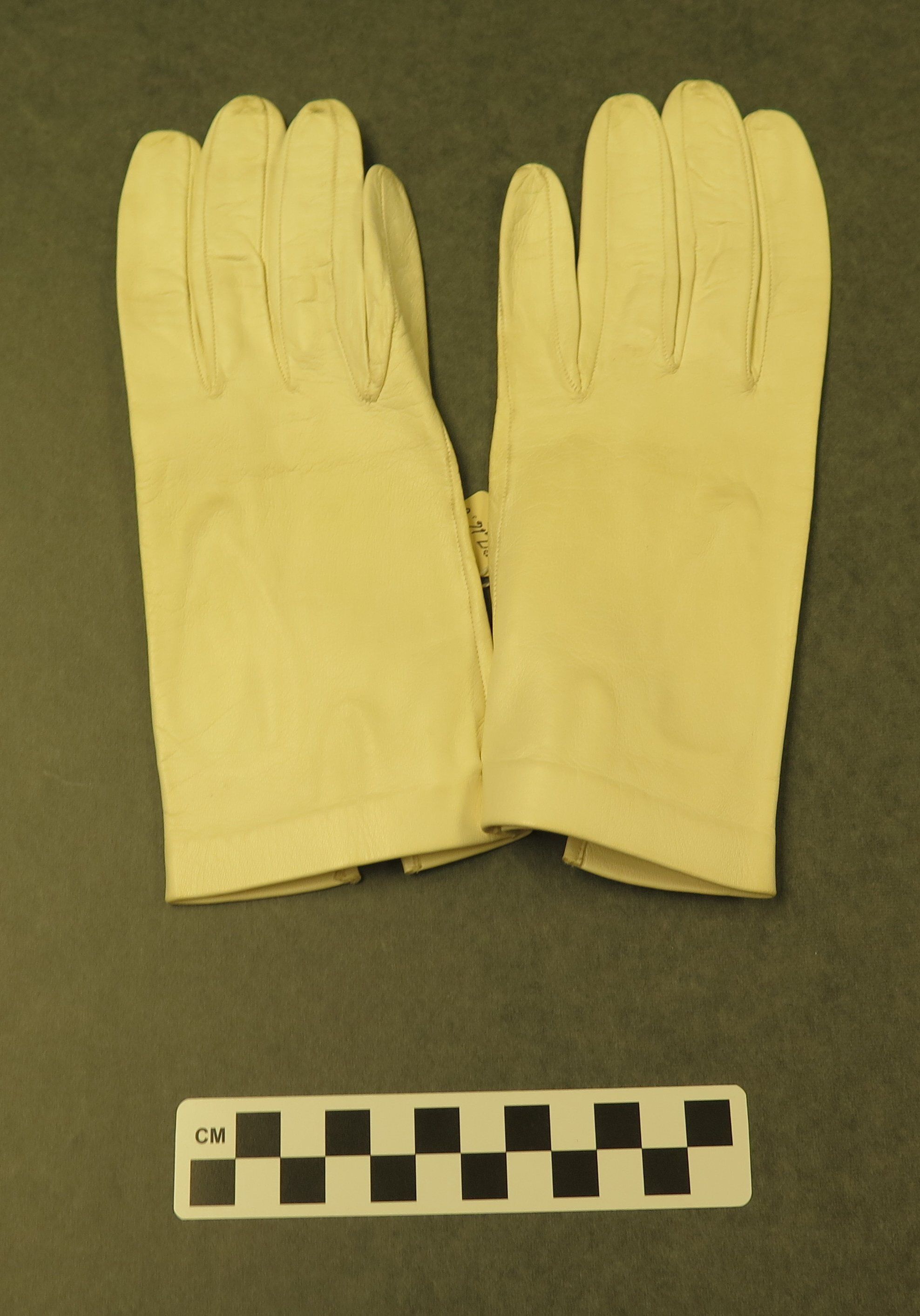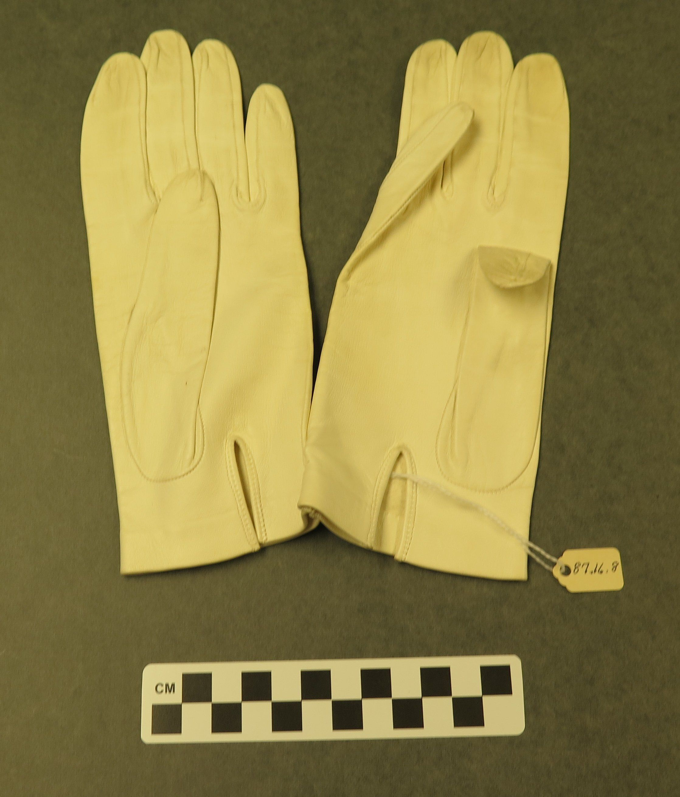 This is a pair of white leather ladies gloves with a slit on the inside of the wrist. The gloves are in size 7.5. Gloves measure 8.5" (w) x 3.5" (l)