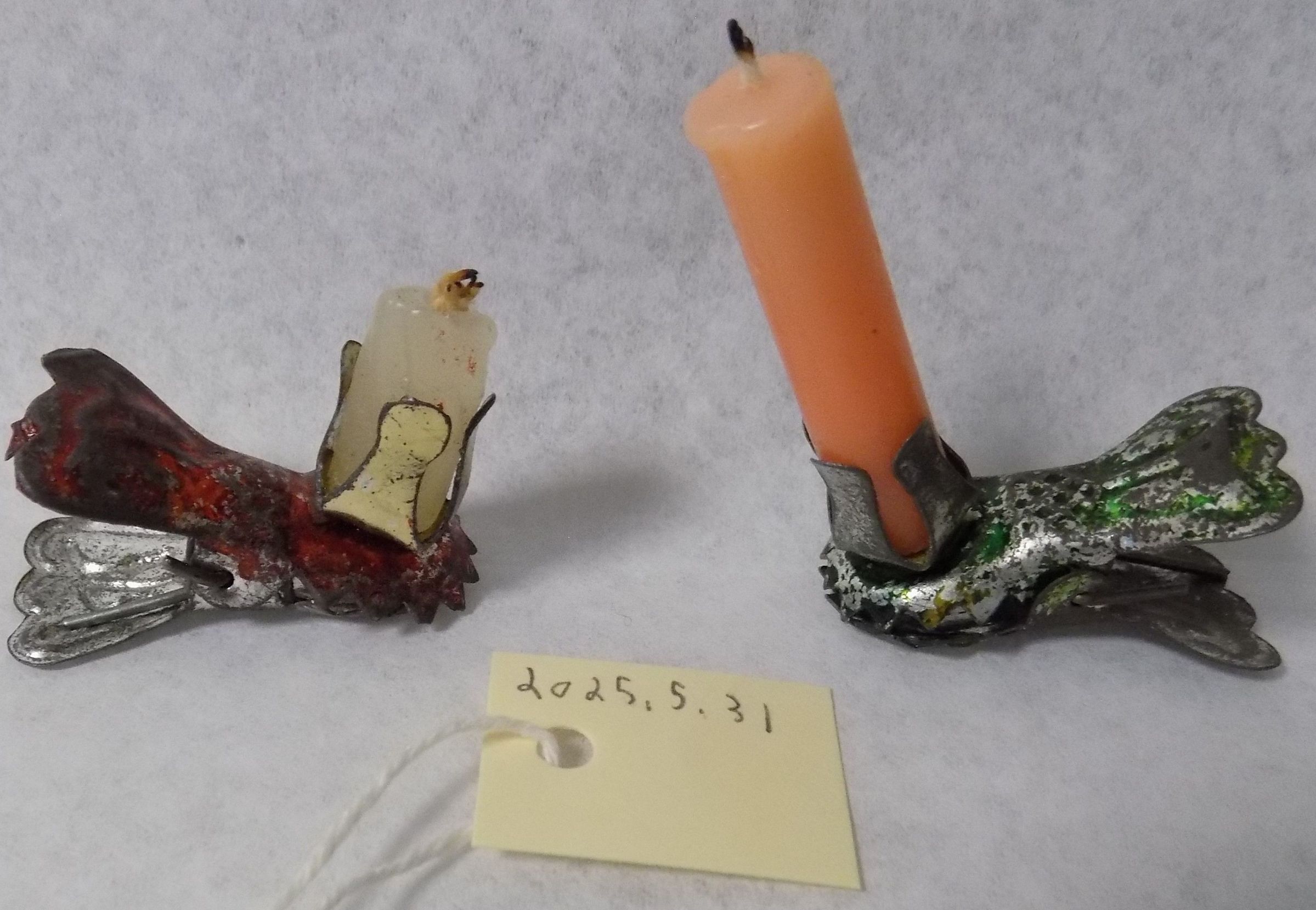 Item is a set of clip-on candles, which were often used to adorn the boughs of Christmas trees during the holidays. The clips are both made of patterned metal, covered in a light layer of rust, with one painted red and the other colored green. The red clip has a short white candle in the holder attached to it, while the green one holds a tall orange candle. The candles are held in a rectangular gold-colored box.Collection