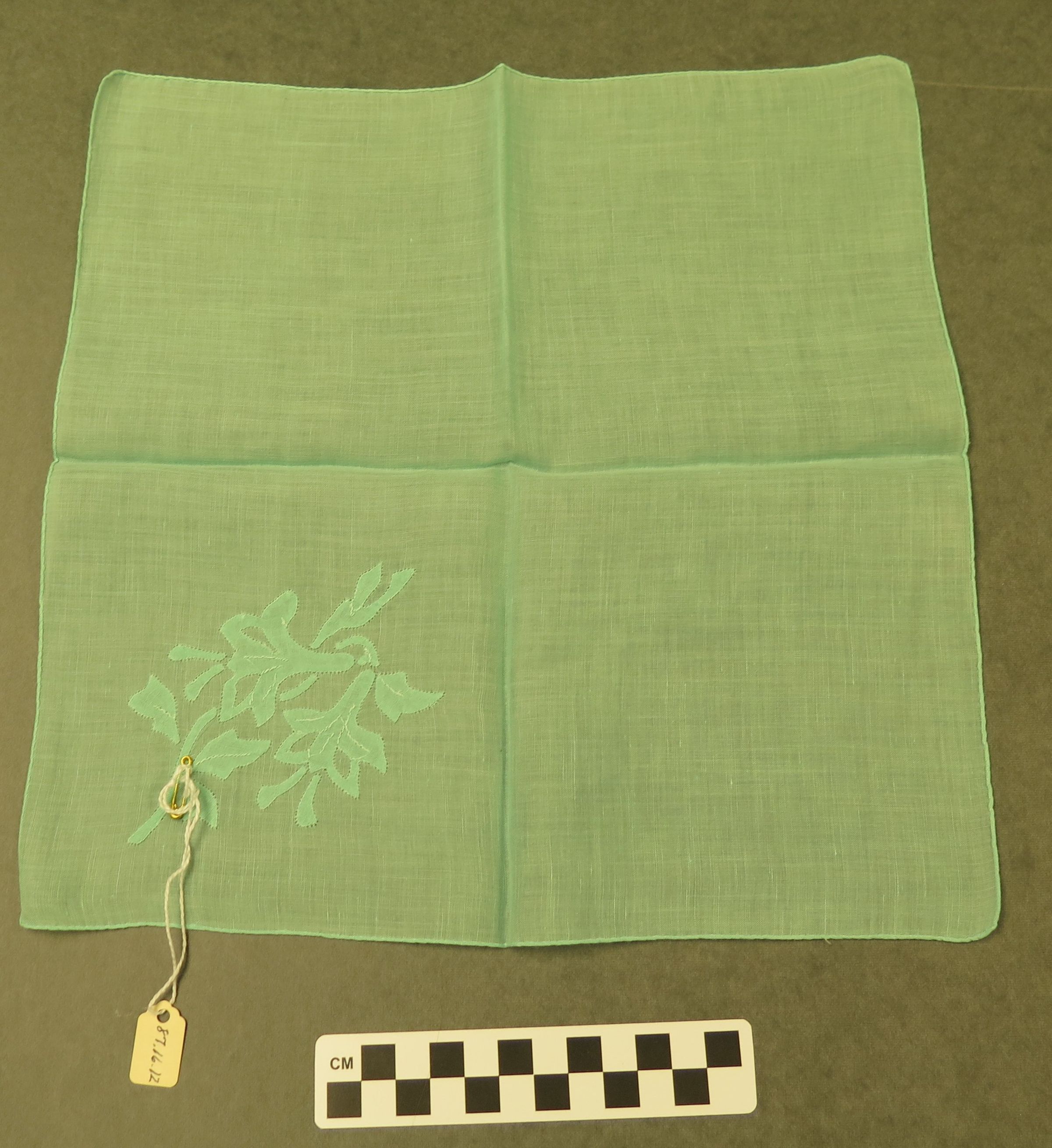 This is an aqua colored linen ladies handkerchief with flowers embroidered in one corner. Handkerchief measures 12" (w) x 12" (l).