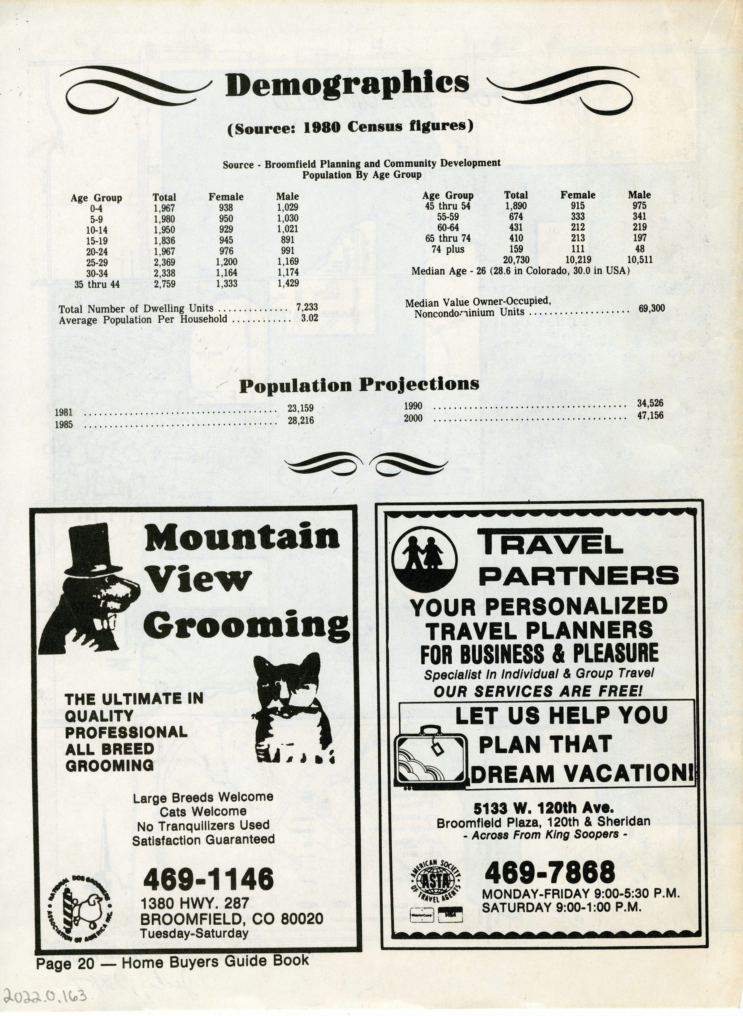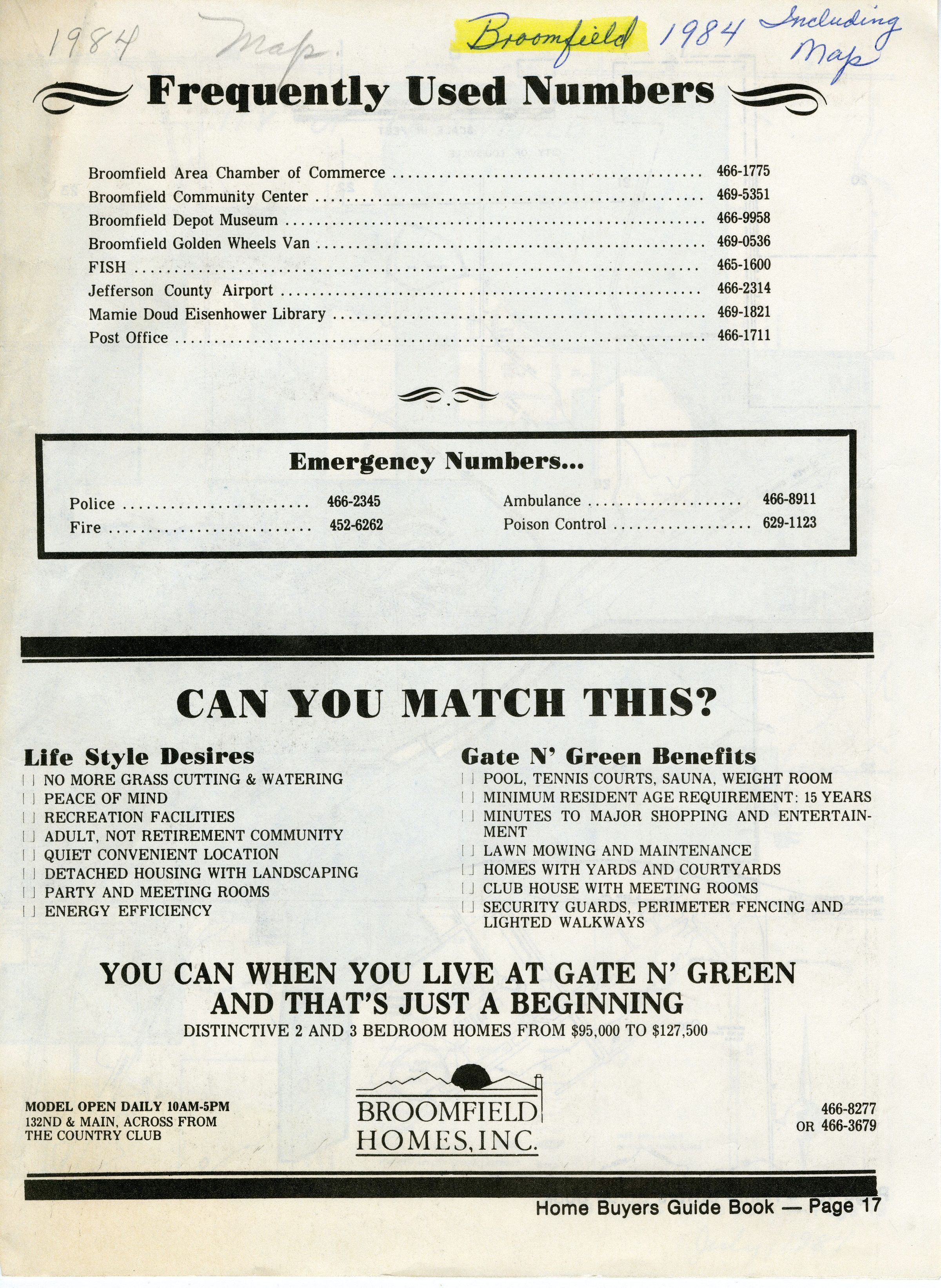 Is an 11x17 piece of newsprint paper folder in half. The front includes a list of emergency and frequently used phone numbers and an advertisement for Broomfield Homes, Inc (Gate N' Green). The back cover lists the demographics (age, sex, number of dwelling units, and value of single-family homes) of the city as of the 1980 census, as well as population projections through the year 2000. Back side also has two ads; one for Mountain View Grooming and the other for Travel Partners.Collection