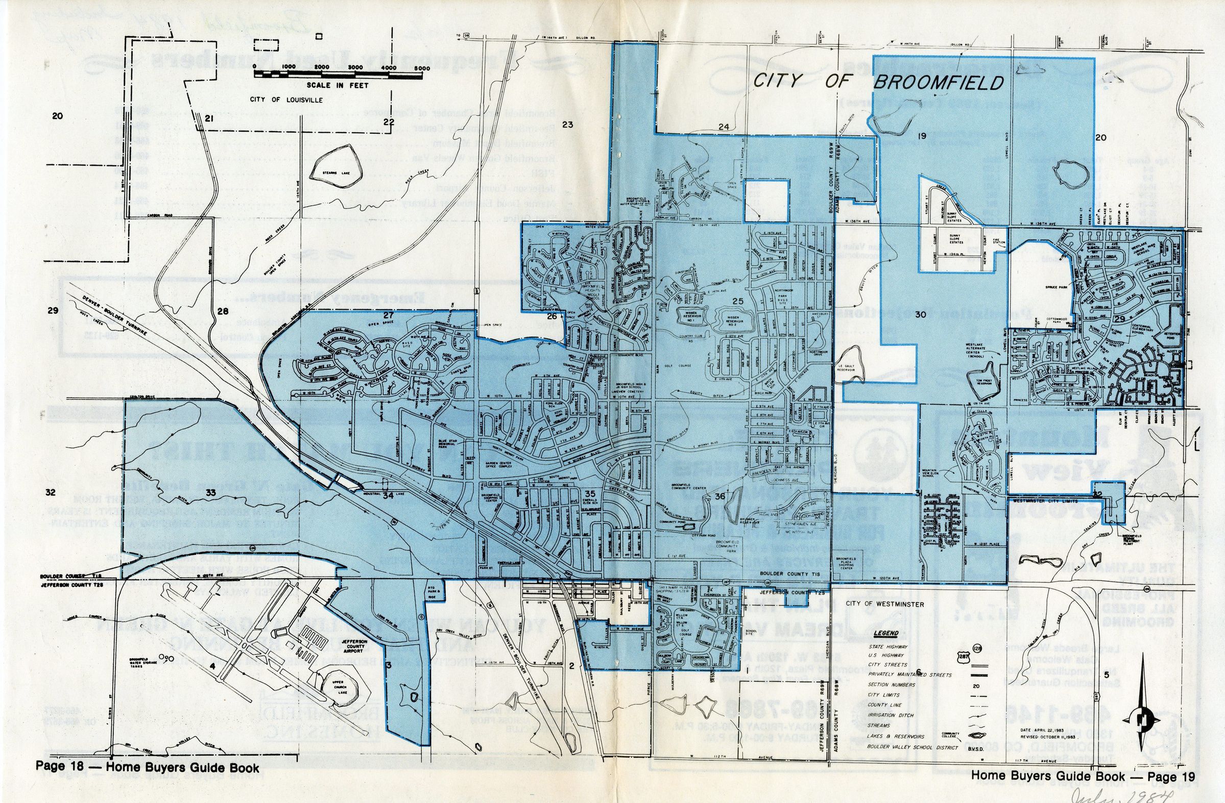 Excerpt from Home Buyers Guide Book (pages 17-20) containing a 1984 map of Broomfield. From Simms Street in the west, to Zuni Street in the east, to 144th in the north, to 112th in the south. Many areas west of Sheridan haven't been incorporated yet.