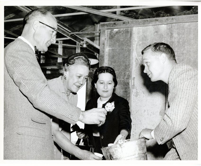 Black amd white photo of 2 guys and 2 women hovering over a bucket for Broomfield's Water Treatment opening. Mary Blakely?