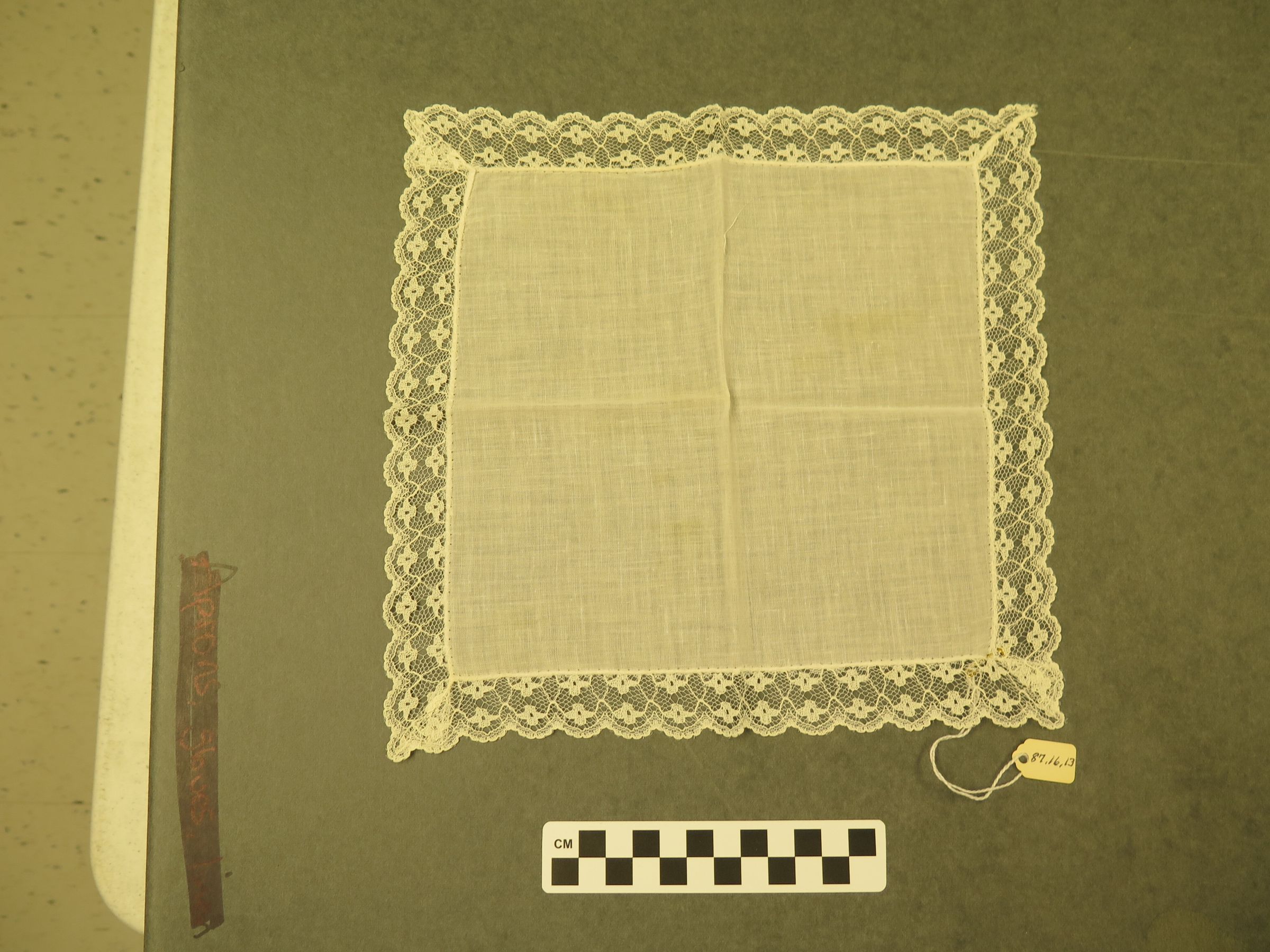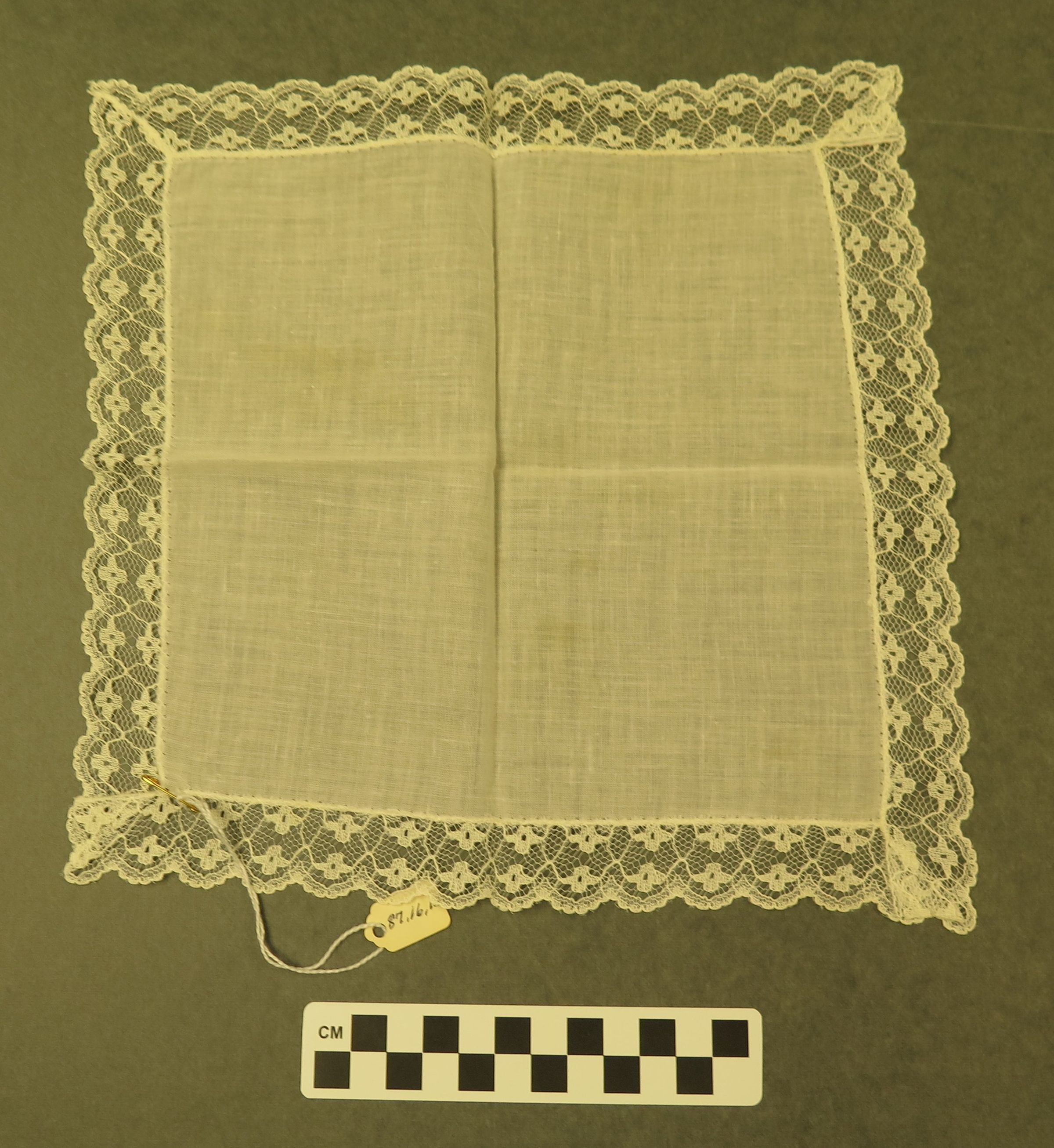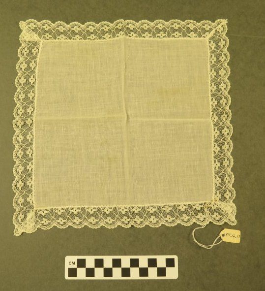 This is a white linen handkerchief with white lace trim. There are yellow stains in the middle of the handkerchief. Handkerchief measures 8" (w) x 8" (l).