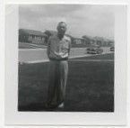 Black and white photograph of a man standing in a front yard. There is a street and other houses in the background. Photograph was taken in a neighborhood instead of a farm. The man is probably Lester C. Brunner. Photograph taken circa 1950s.