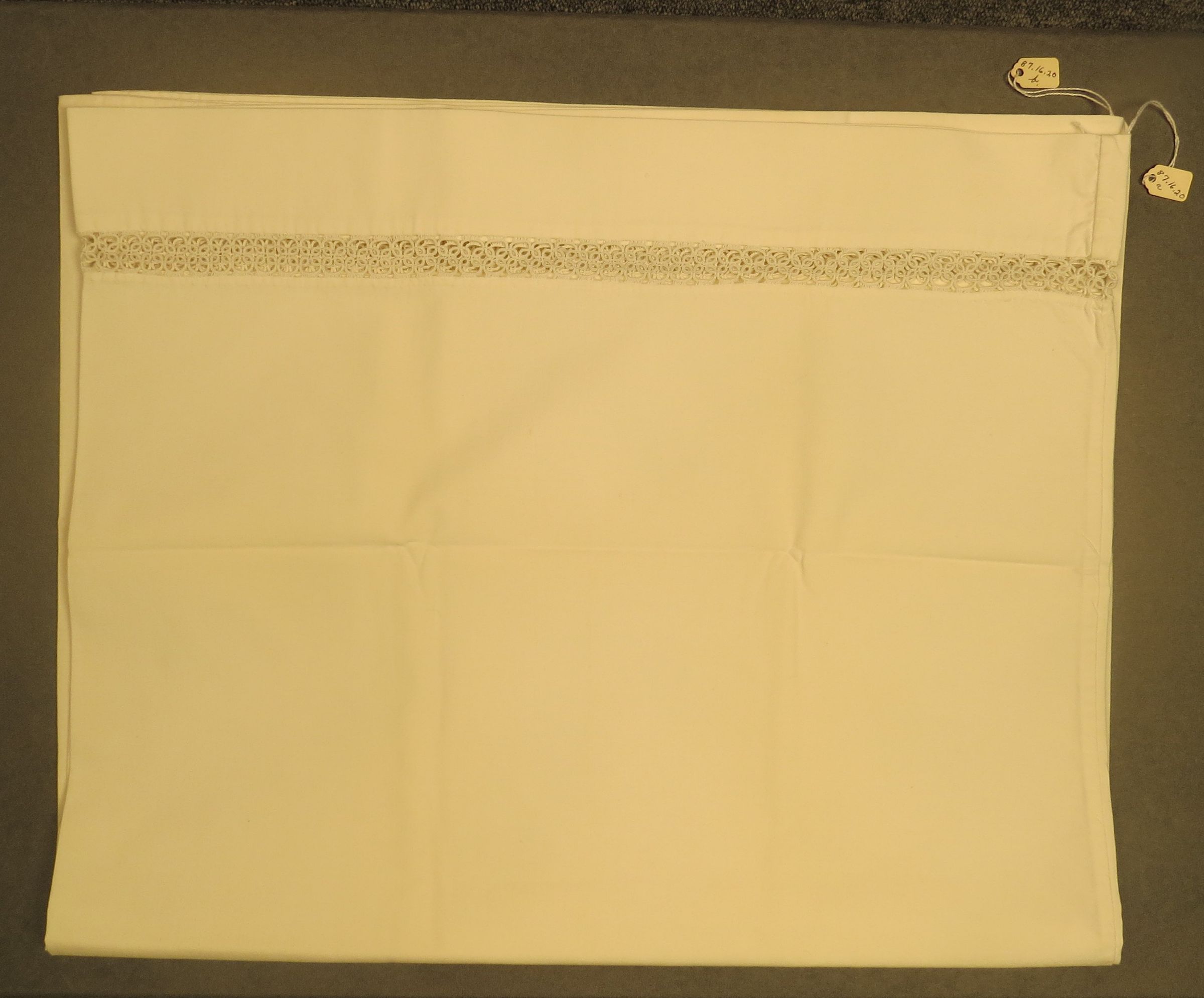 High quality matching white pillowcases. High thread count cotton. At the open end there is an inset about 2 inches in of circular tatting. These pillowcases are similar to (except for size) 1987.16.20a-b, 1985.5.17 and 1985.5.18. Pillowcase measures 20" (w) x 31.5" (l).Collection