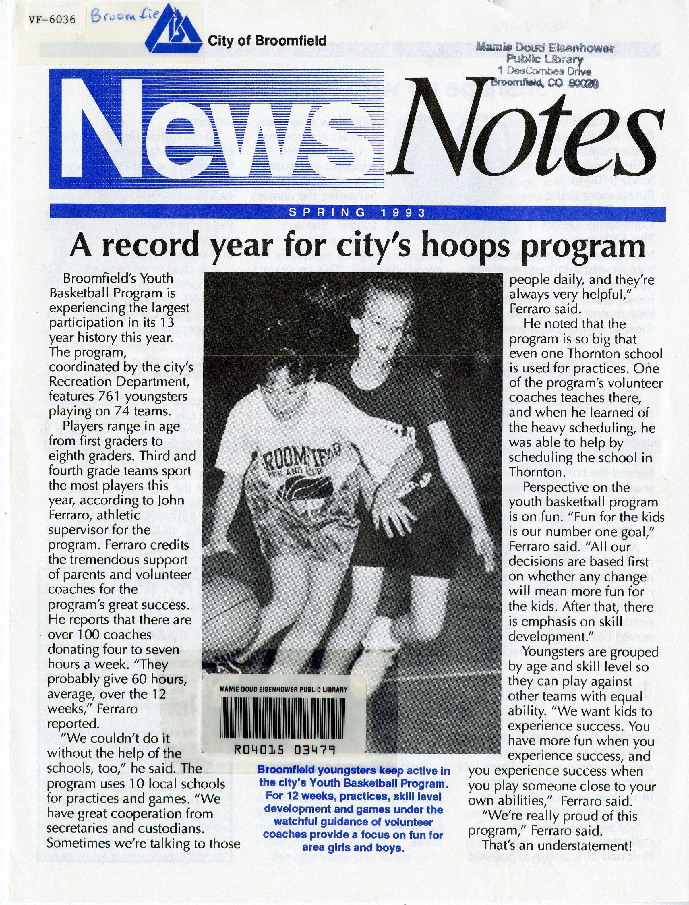 Spring 1993 News Notes newsletter for the City of Broomfield. Includes segments on the Youth Basketball Program, a new fitness room at the Community Center, plant recycling, new rules at The Loft, programs at the library, and news about the Police.