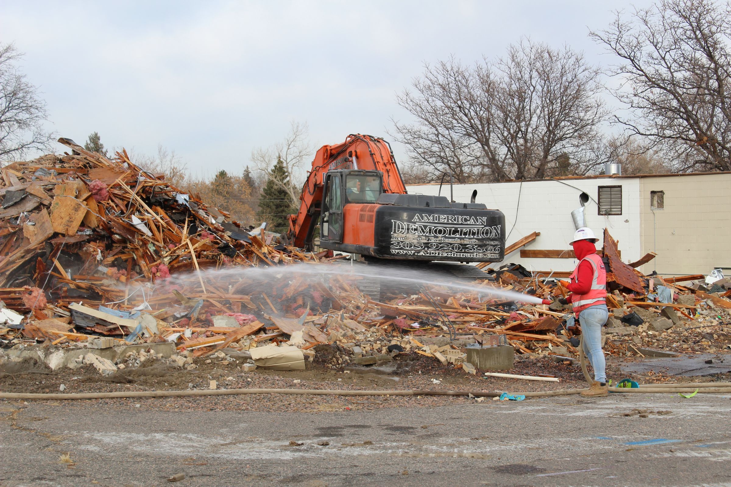 First North Metro Fire Station During Demolition. December 2021. Midway Boulevard. Worker hoses down rubble.Made/Created