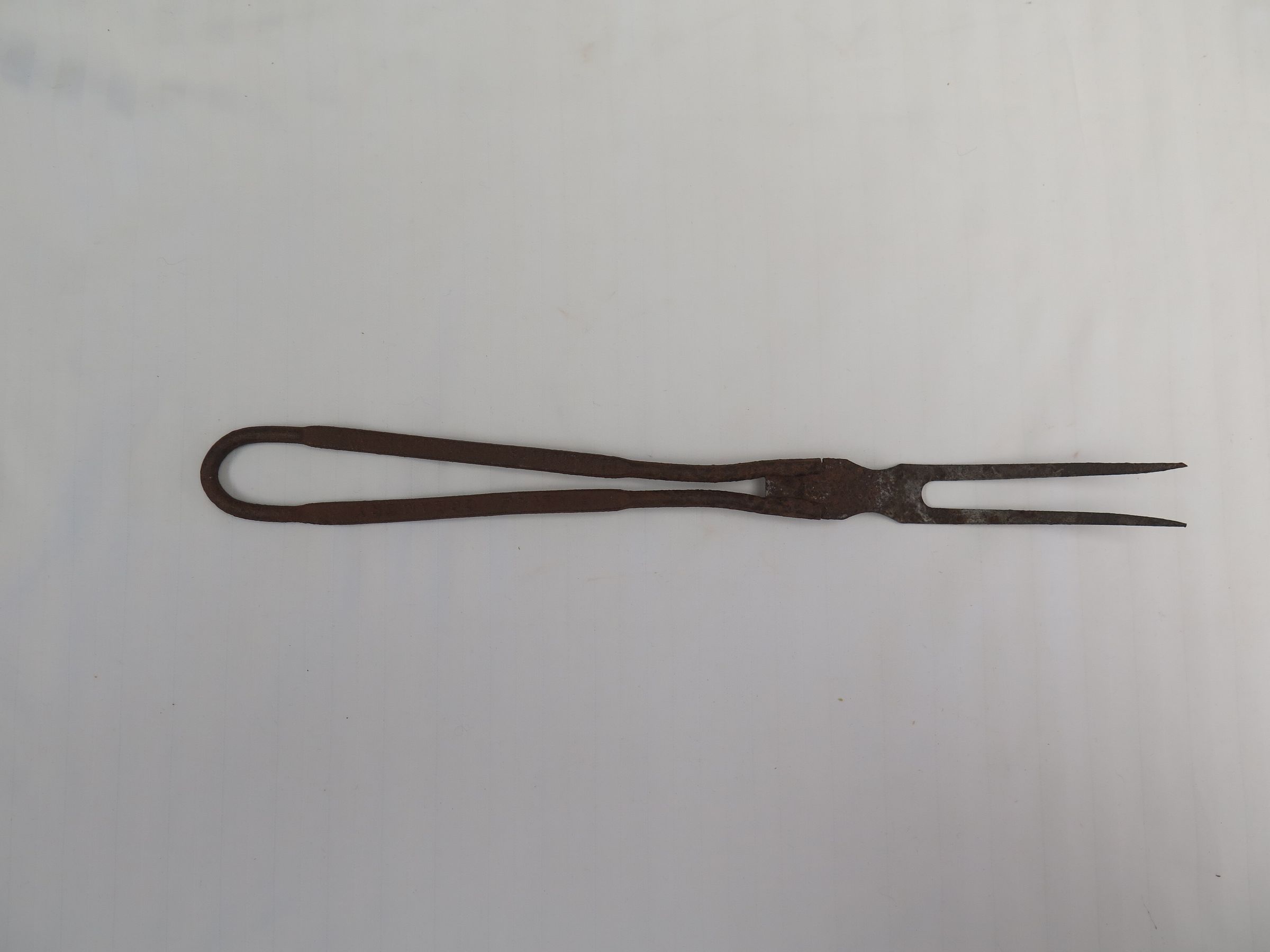 This is a rusty metal fork with 2 prongs and a looped handle. The fork measures 1" (w) x 13" (l).