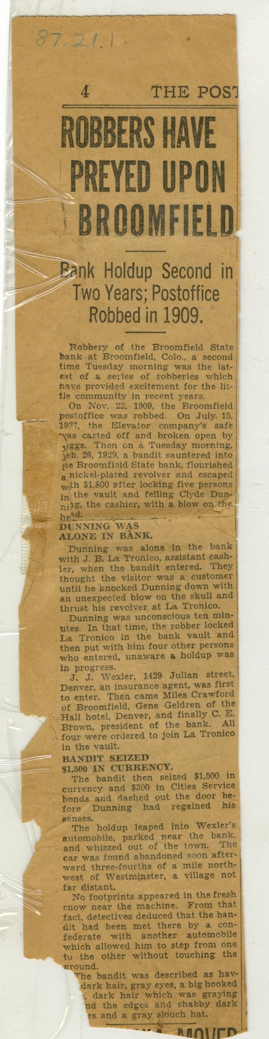 newspaper clipping, February 26, 1929, Denver Post clipping about Broomfield Bank robbery. This was this first of 2 robberies that would occur at the bank before its closure during the Great Depression. In this robbery, a ragged-looking bandit held the bank at gunpoint. He locked 5 people in the vault, knocked the cashier out with the gun, and stole $2,000+. He was never caught.Collection
