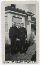 Black and white photograph of two men standing in front of a farmhouse. Both men are wearing naval uniforms. Visible in the background is a bay window and the side of the Brunner farmhouse. From left to right, the two men are Gib and Clyde Brunner. Handwritten in blue ink is "Gib 1st Clyde 1st after So Pa." It is likely that So Pa stands for South Pacific.