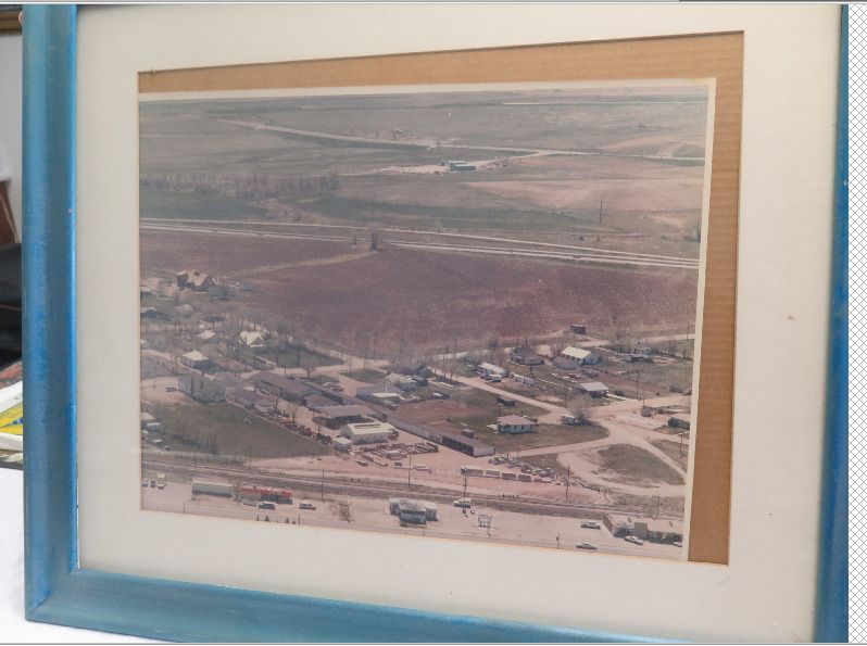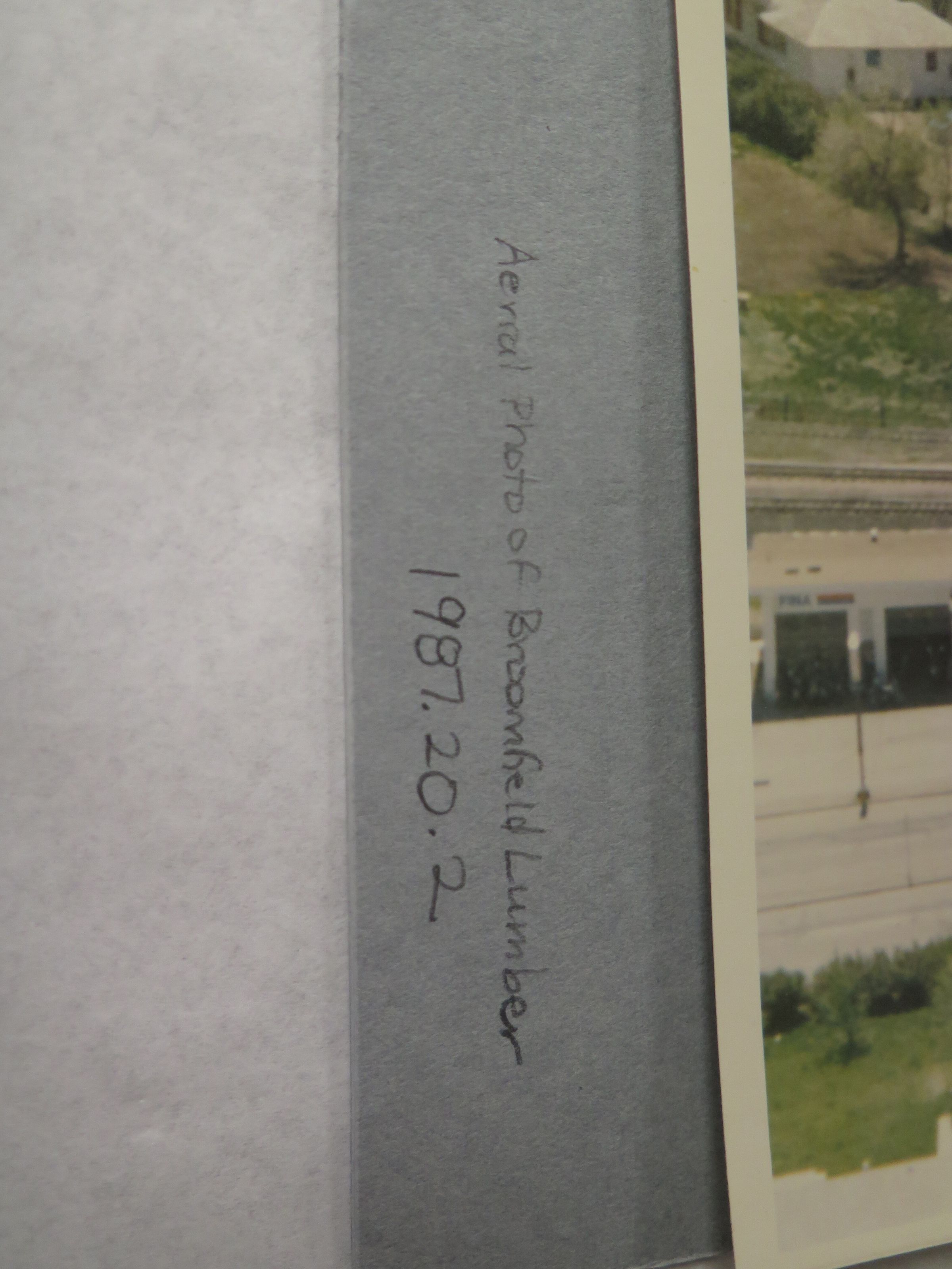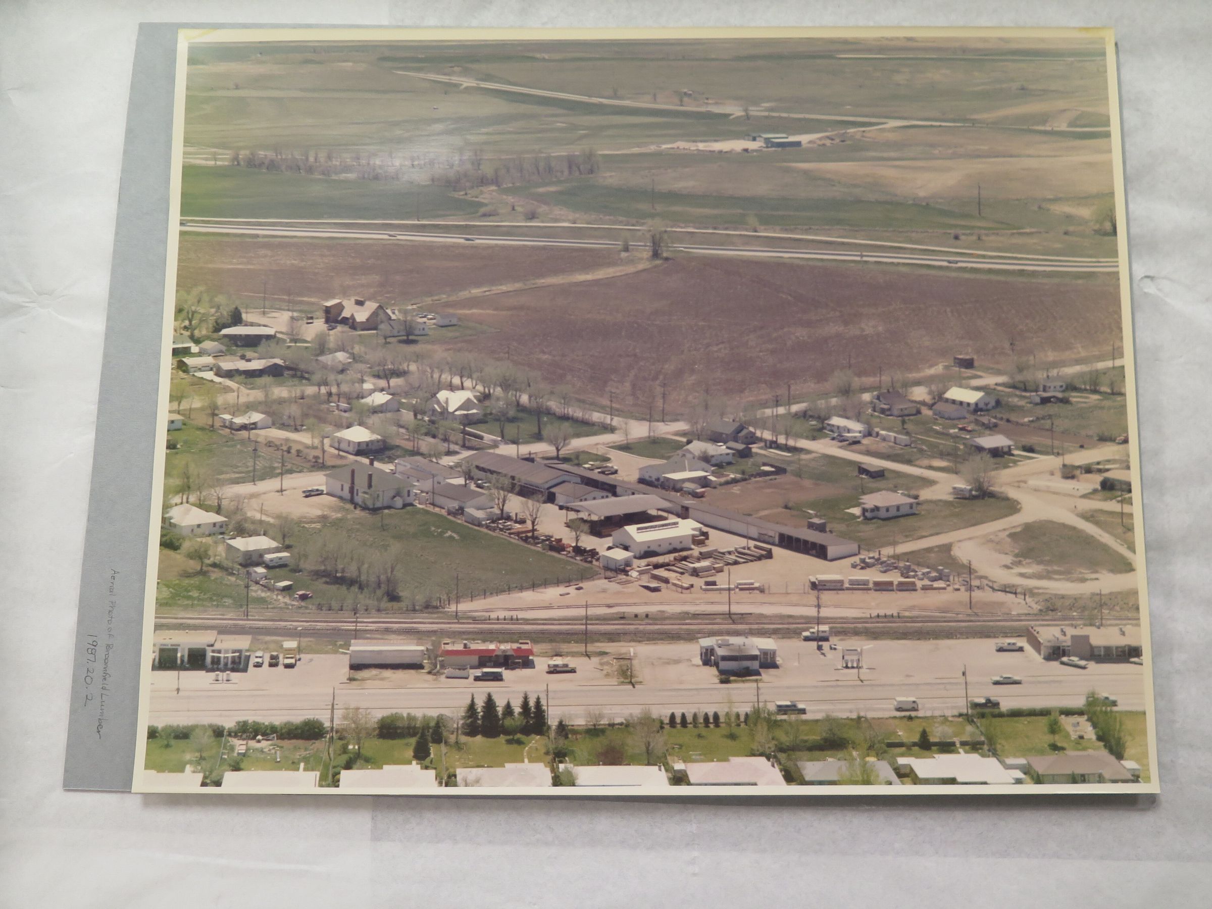 This is a color photograph of an aerial view of 120th Avenue in Broomfield showing the Broomfield Lumber Company. The colors in the image are faded.