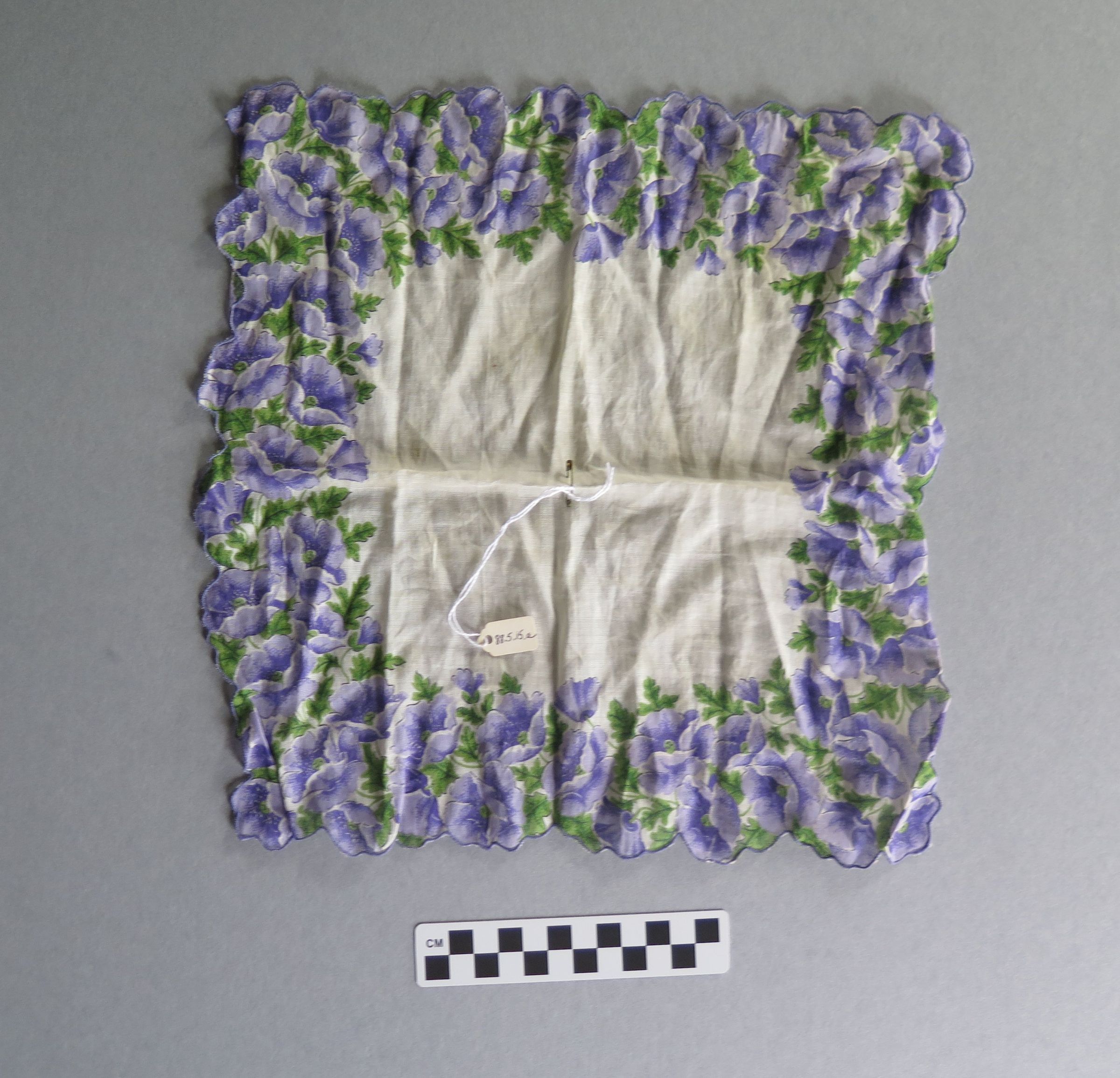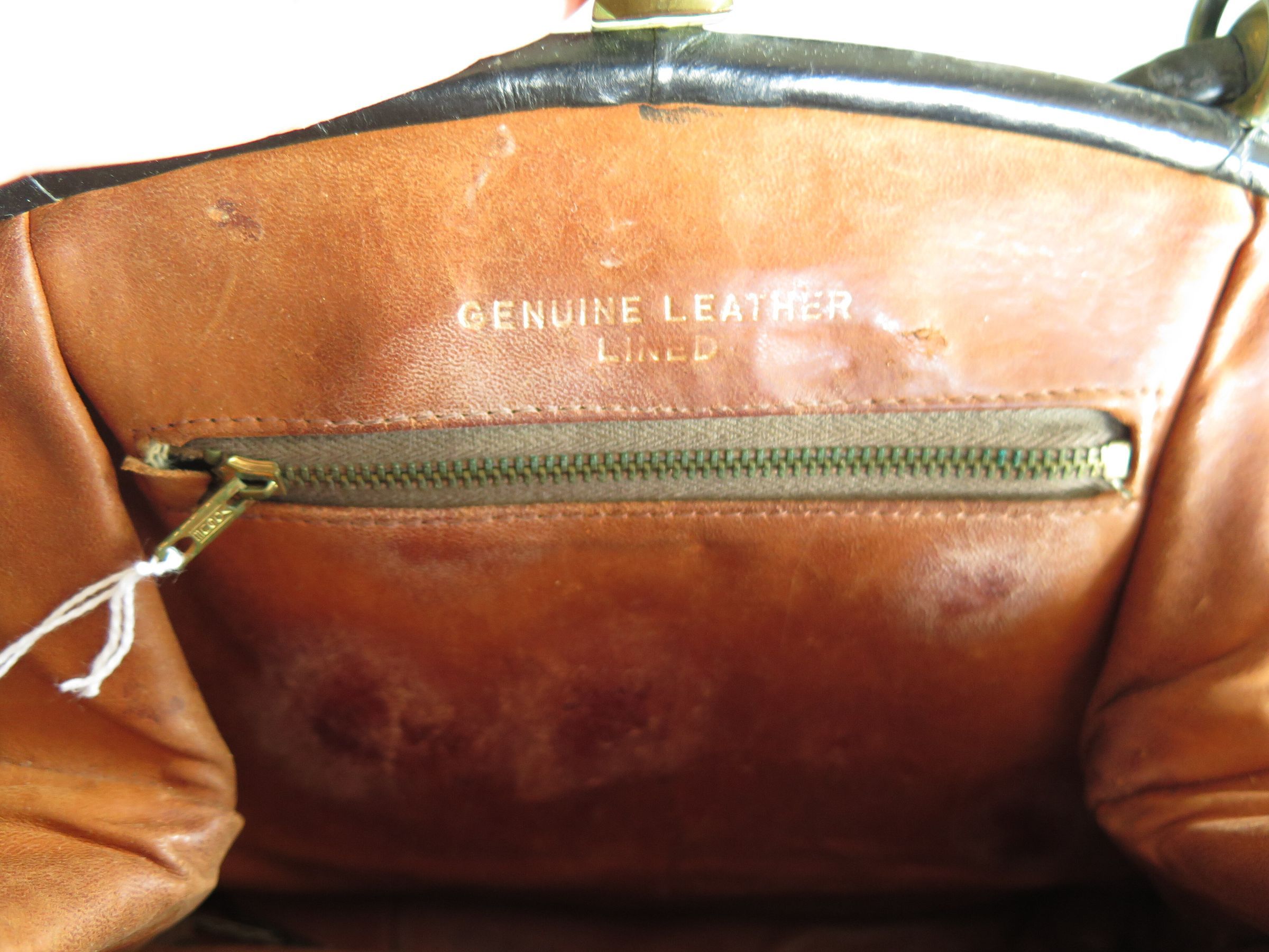 Women's black leather purse (leather lined) with handkerchief. Inside of the purse is brown and reads "Genuine Leather Lined" in gold text. The top of the purse clasps shut. Purse measures 22" (l) x 9" (w) x 3" (h). The handkerchief is white with purple flowers and green leaves bordering the outside. The handkerchief measures 11" (w) x 11" (l).