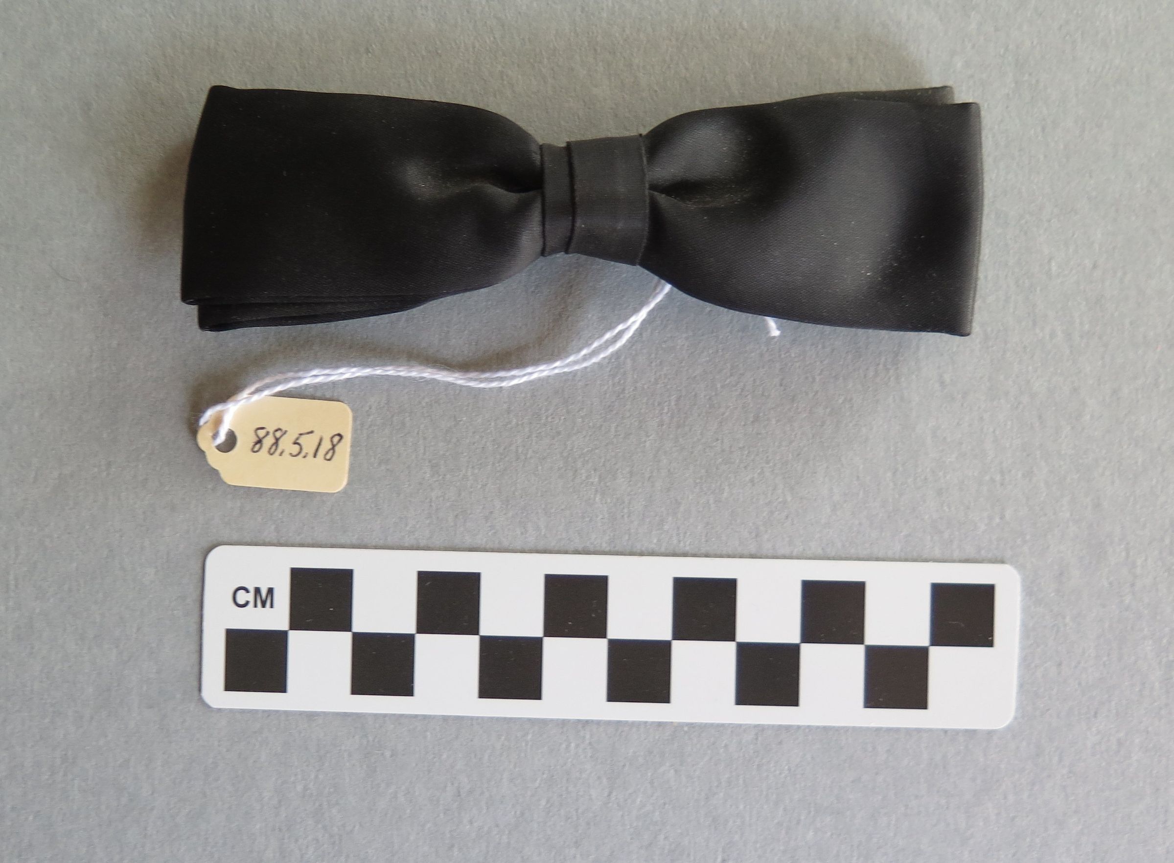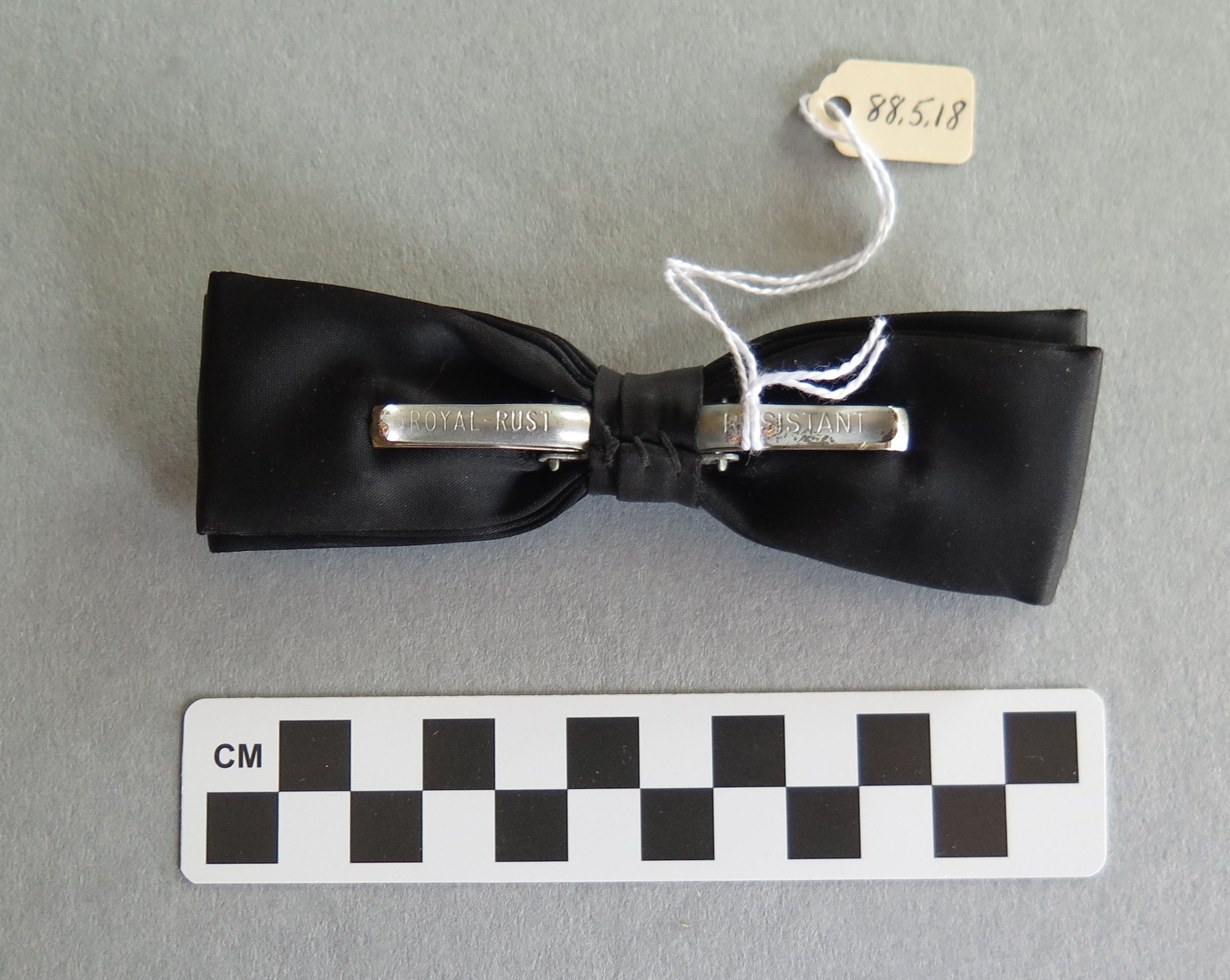 Black clip on satin bowtie. The clips on the back of the bowtie say "Royal Rust Resistance." The bowtie measures 6.5" (l).