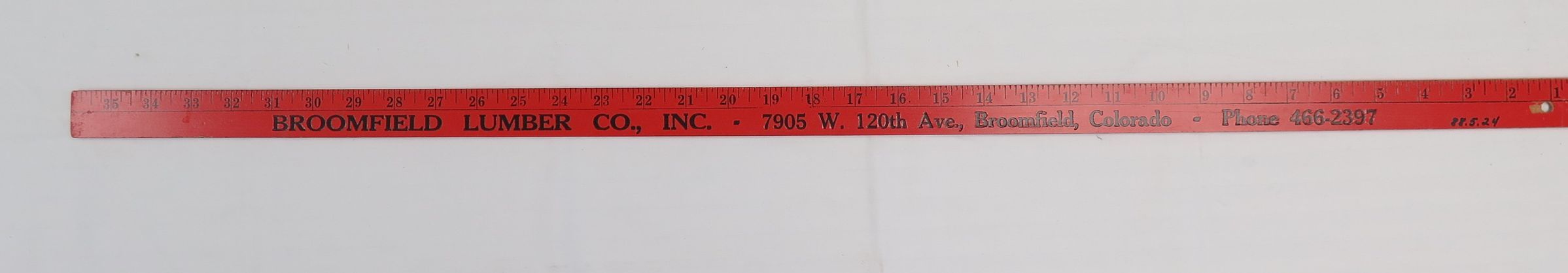 This is a wooden yardstick from Broomfield Lumber. The yardstick has been painted red. The yardstick measures 36" (l).