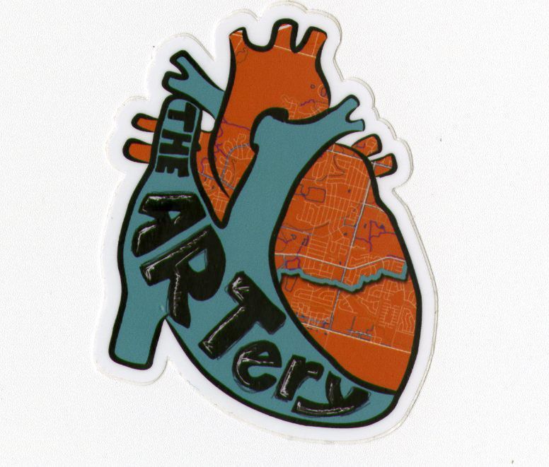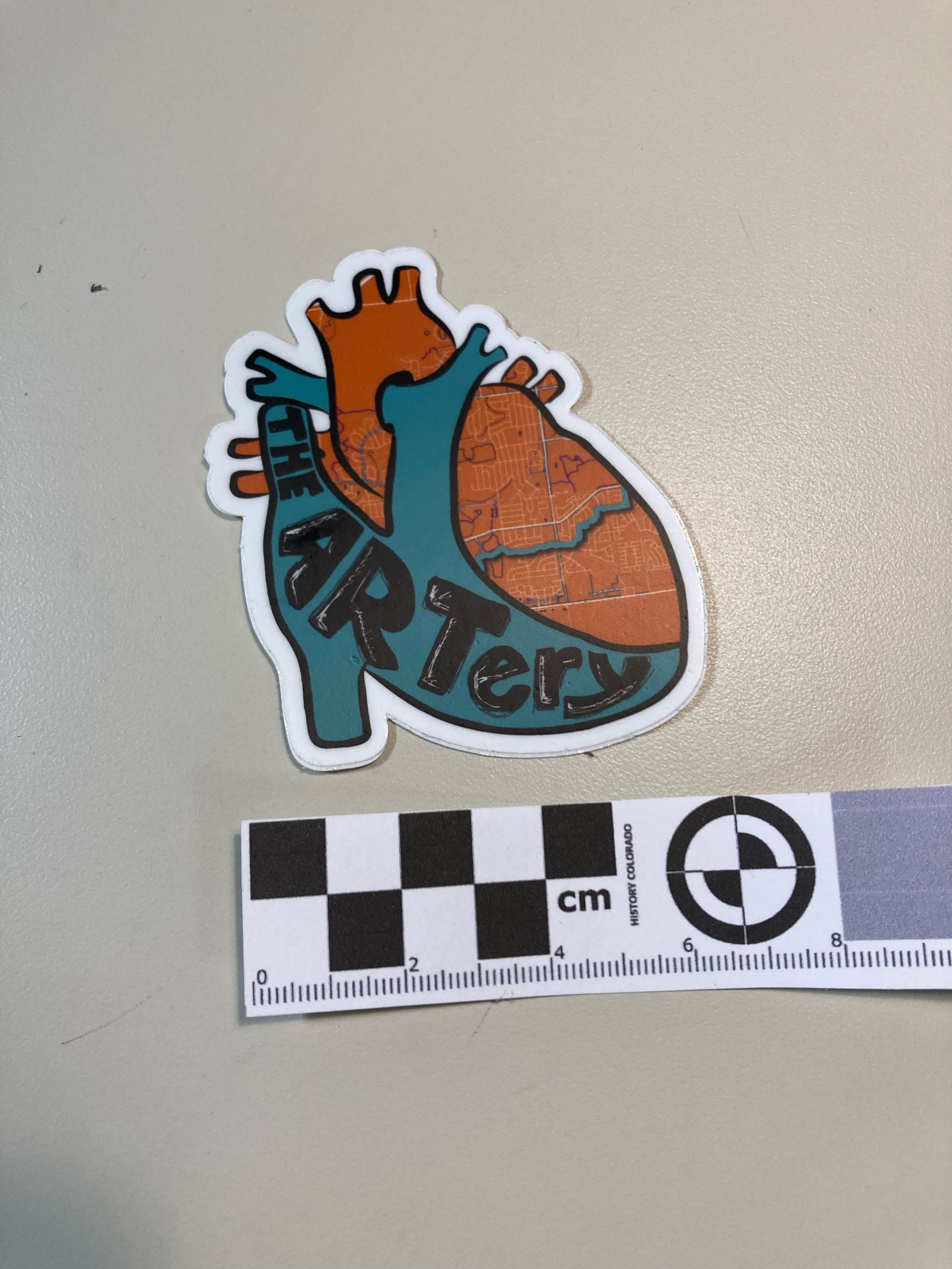 This a Broomfield "The ARTery" Sticker. It's shaped like a heart with green and orange . "The ARTery" is written in black on the green area and the map of Broomfield is printed on the orange part. This was created by Elaine Jones in 2022 and was printed on June 15, 2022 for the ARTery project to connect Broomfield through a walkable art path through the city.Collection