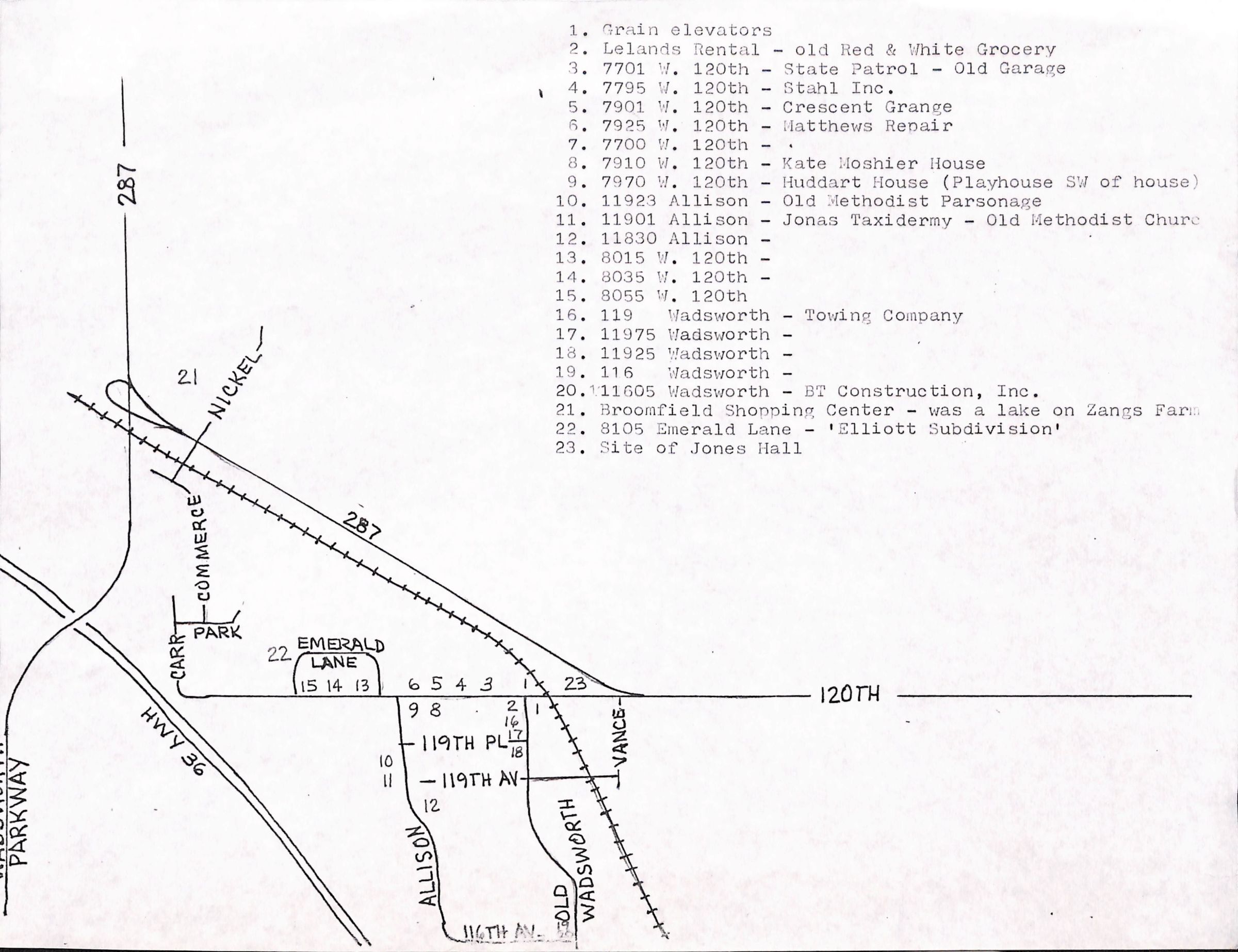 This is a map of the Southwest corner of Broomfield between 287, Highway 36 and 120th. This map shows varies locations (most likely historic) of Broomfield. The locations are numbered with corresponding numbers to the key.