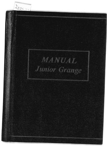 Item is a pocket-sized hard-bound book titled "Manual / Junior Grange," likely utilized by the Crescent Grange, an organization that served as a means of social gathering for early Broomfield residents. The manual has a deep red cover with green accents. The interior of the book states that this is the twenty-first version of the manual, issued by the National Grange in 1972, and that the Grange Master should know its whereabouts at all times. The manual contains information on specific rituals practiced by the Junior Grange, emphasizing the correct greetings and lines of dialogue that members should use. It also includes information about different roles in the group and rules of conduct.Collection