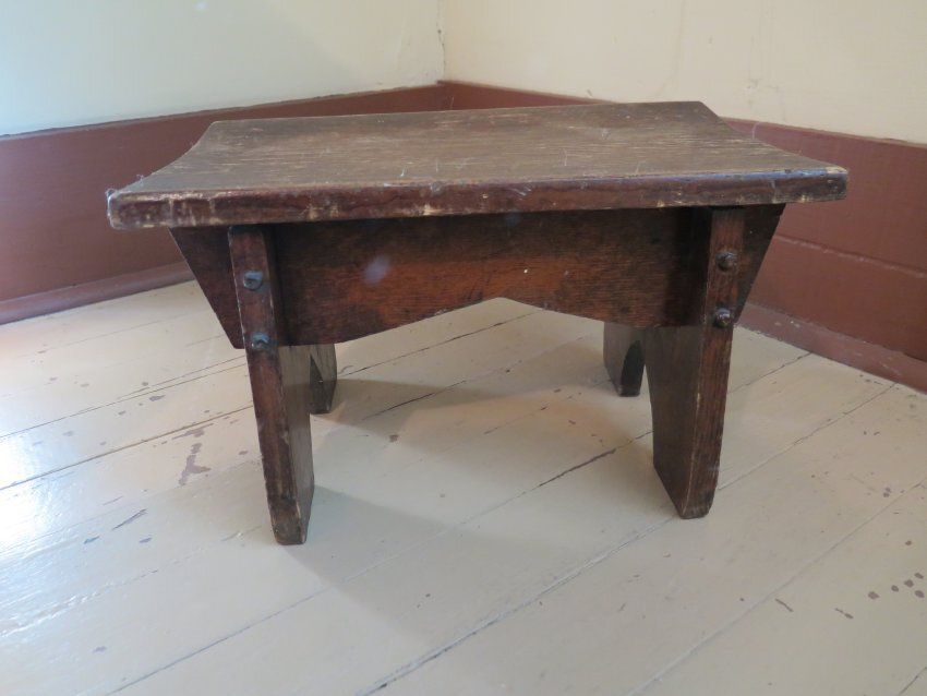 This is a short wood step stool with 4 legs. The stool measures 9" (h) x 9.5" (w) x 15.75" (l).