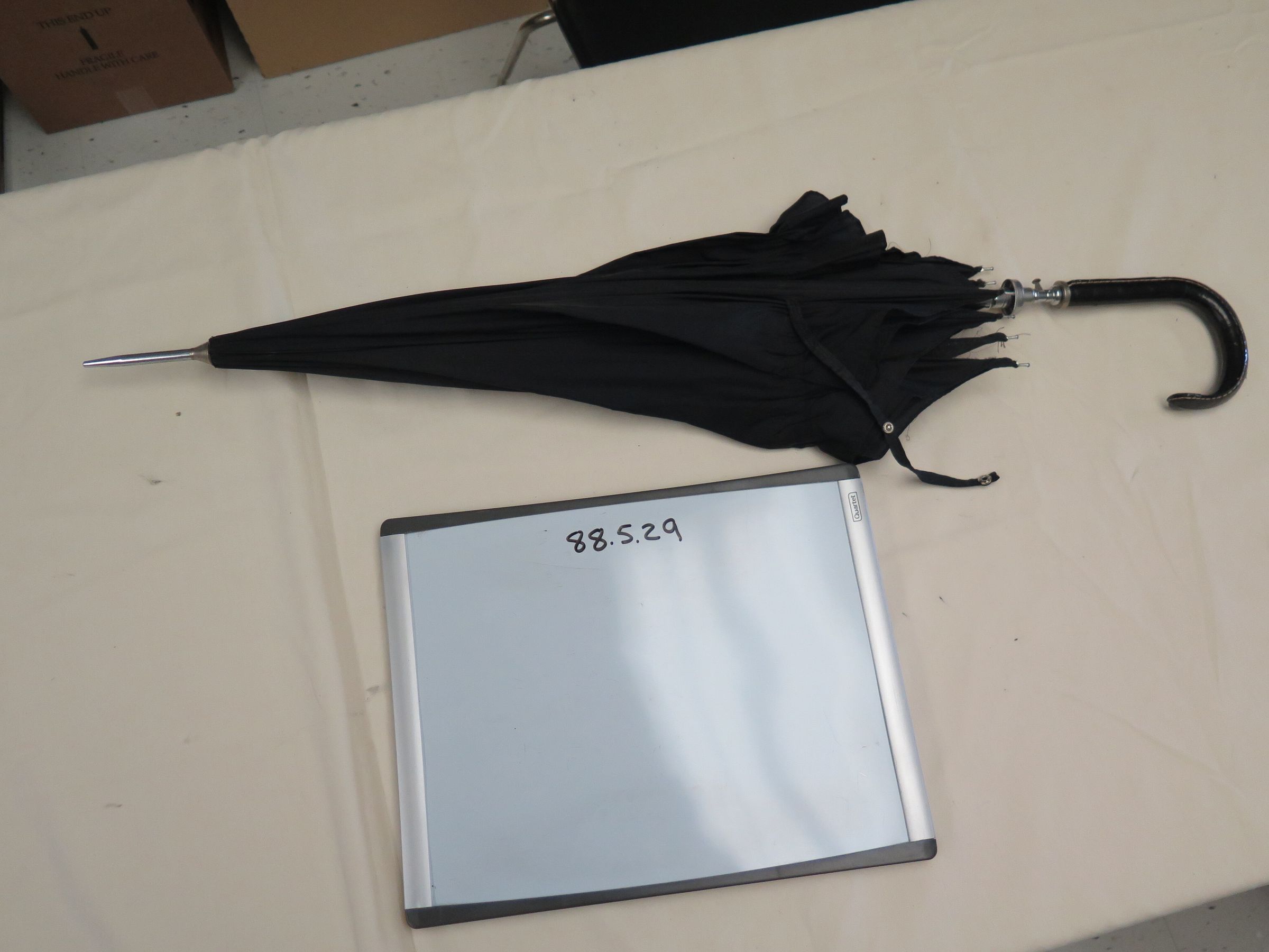 This is a black umbrella with a metal tip and painted handle. It measures 35" (h) x 4.5" (w).