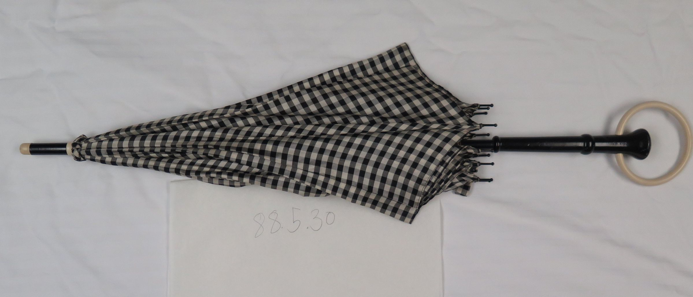 This is a back and white checkered umbrella with a white loop handle. The umbrella measures 7" (w) x 31" (l).