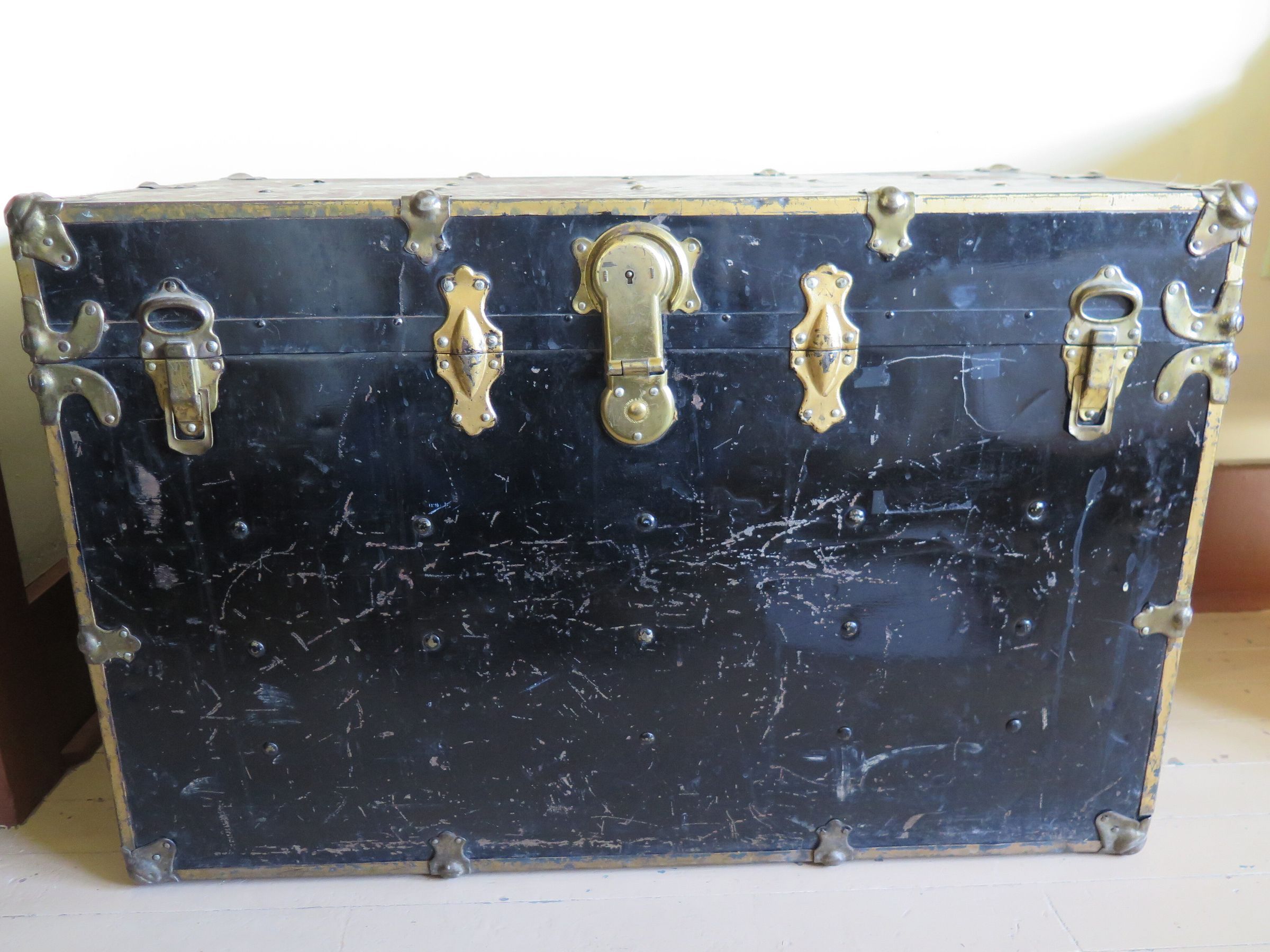 This is a black trunk with gold colored hinges and latches. The top of the trunk opens up on hinges, and is not completely removed. The trunk measures 23" (h) x 36" (w) x 19.5" (d).