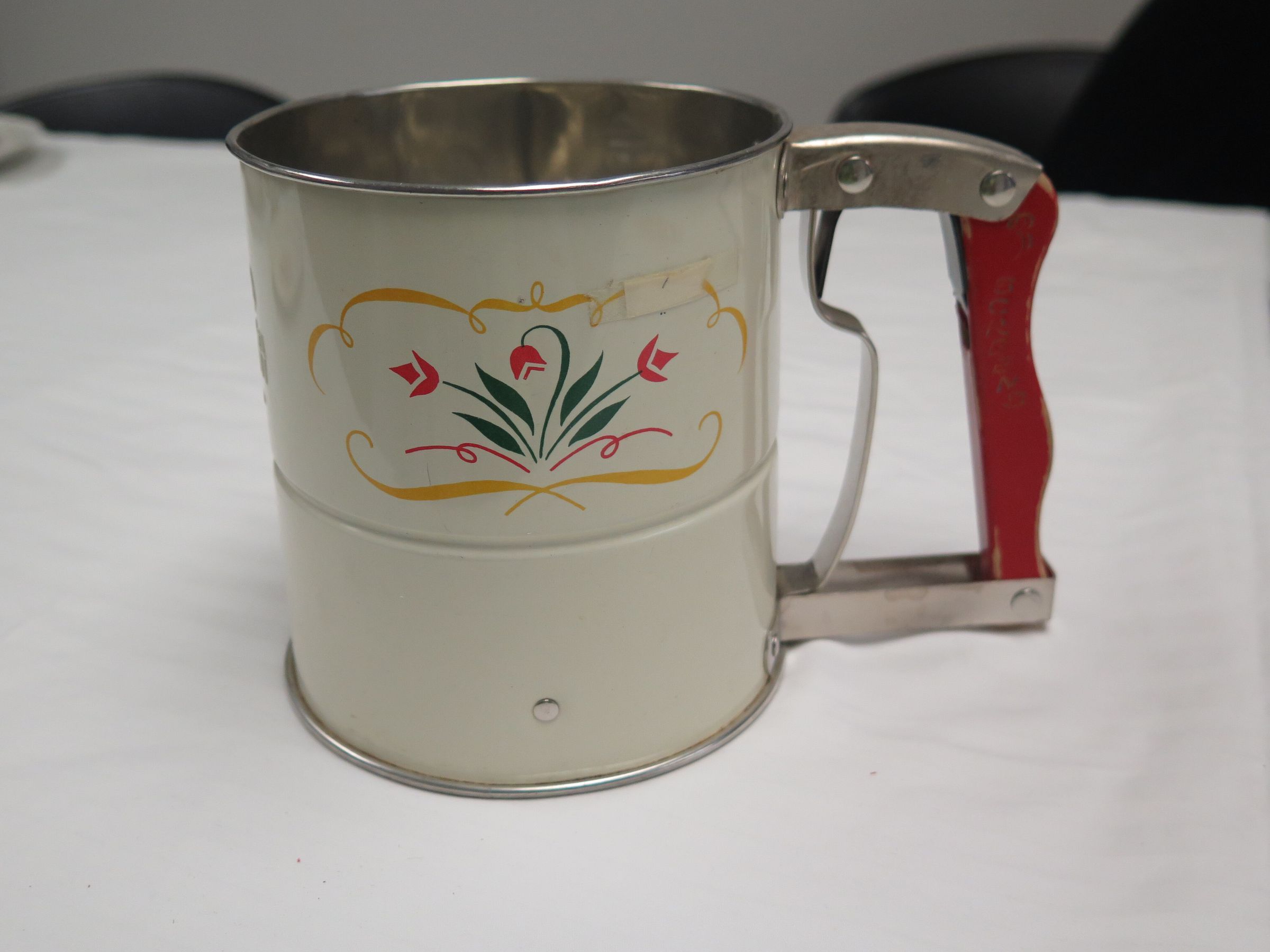 This is a metal sifter with a red wood handle. The side of the sifter is cream-colored with a floral design on it. The sifter measures 5.5" (h) x 7.25" (w).