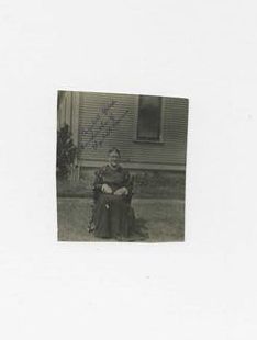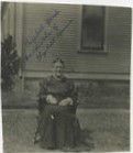 Photograph, black and white, woman sitting in a chair near the side of a house. Writing on photo in upper left corner reads, "Elizabeth Yarde ... of Elizabeth Brunner"