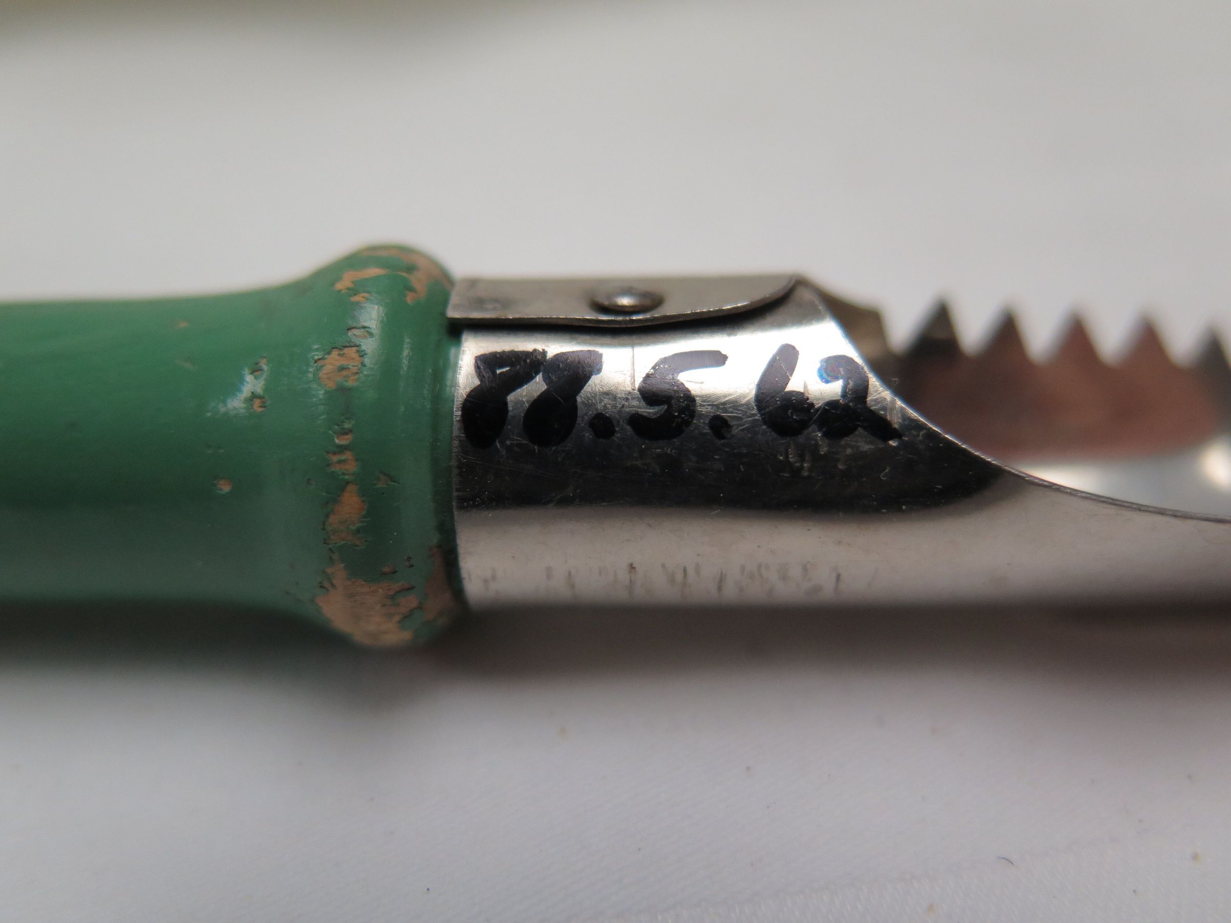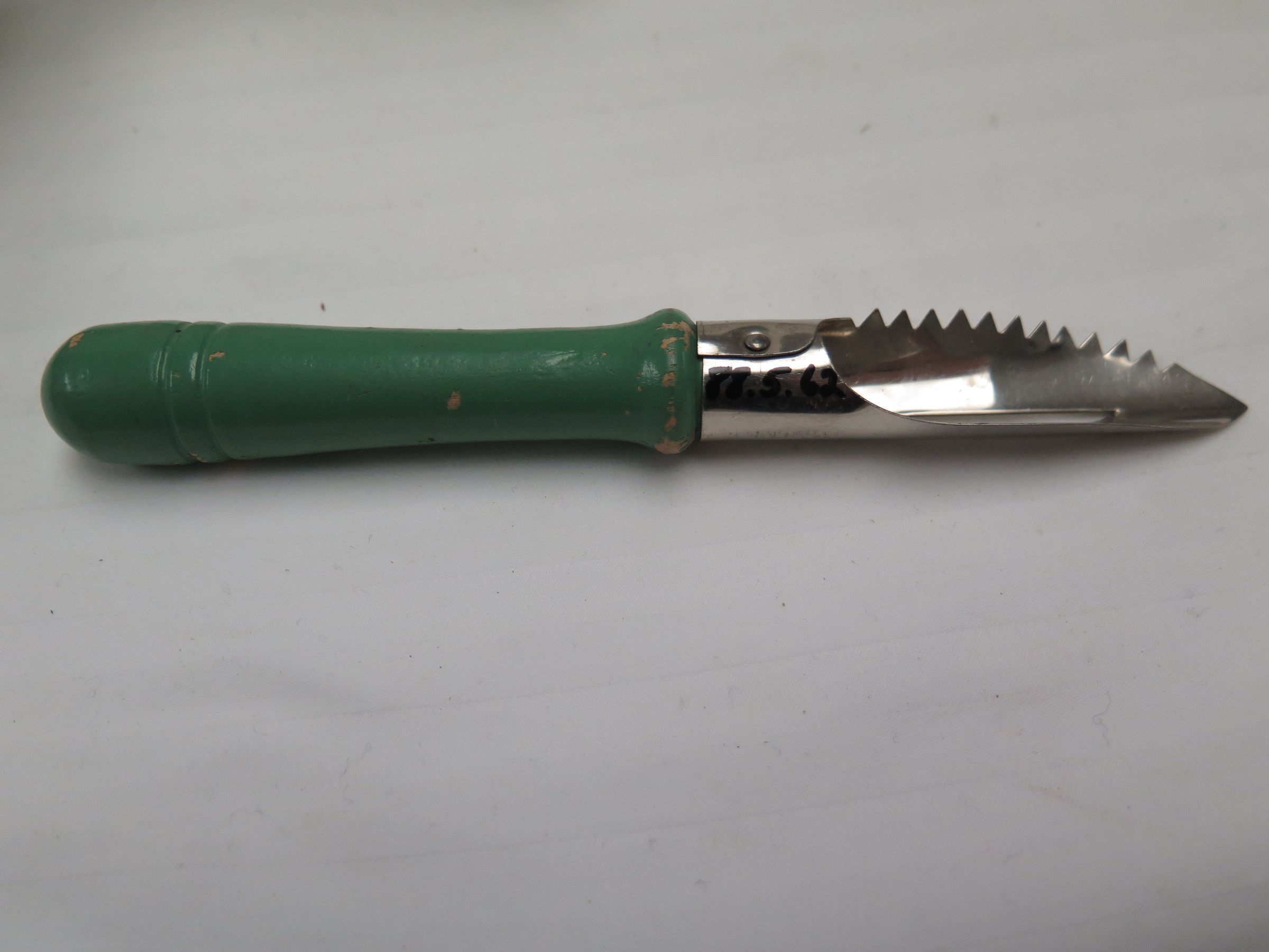 This is an apple corer and peeler with a green handle. The peeler is metal with a wooden handle. The corer measures 7.5" (l) x 1" (dia).