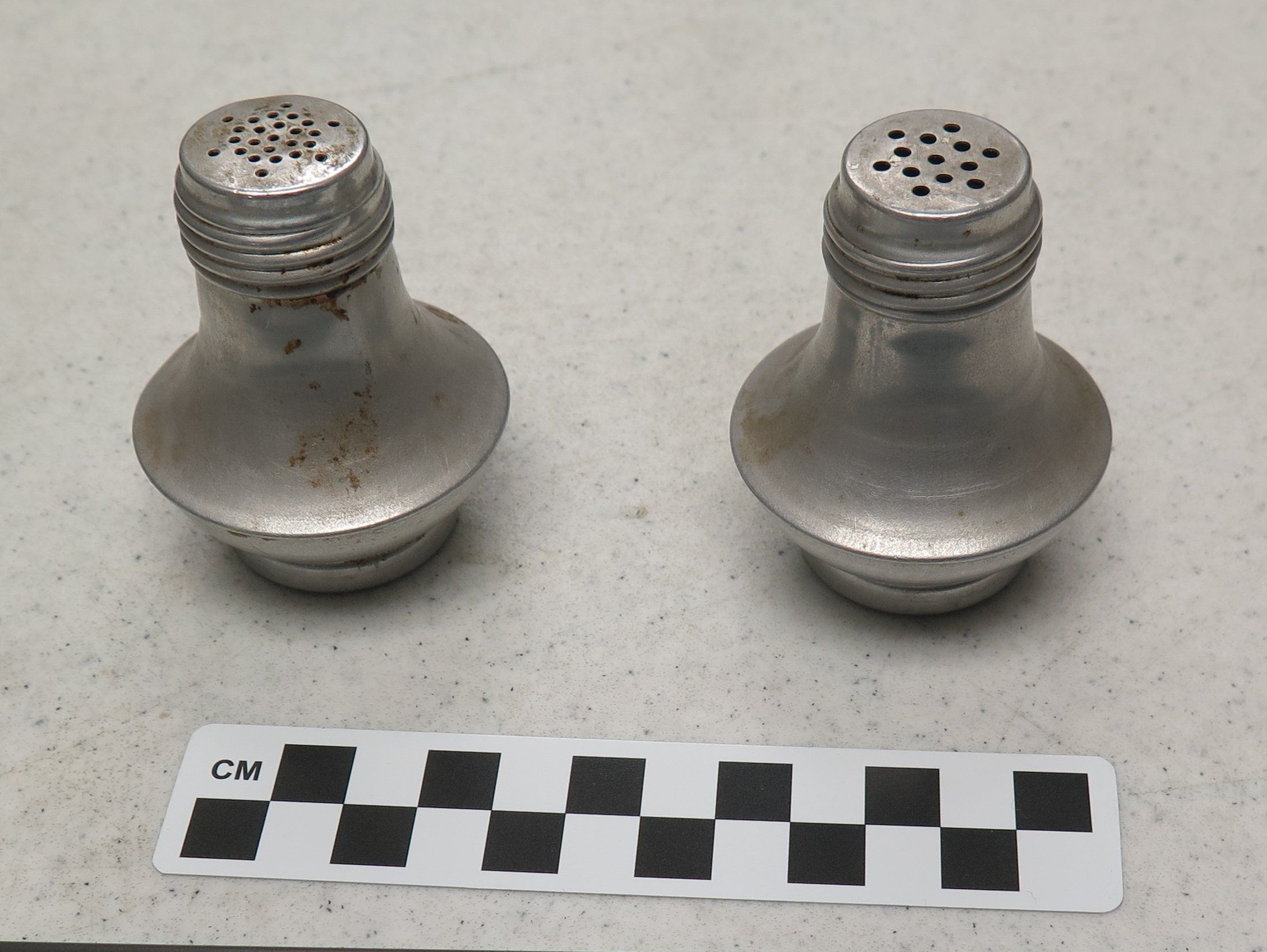 This is a set of metal salt (a) and pepper (b) shakers 2.5"(H) x 2.5"(Dia)