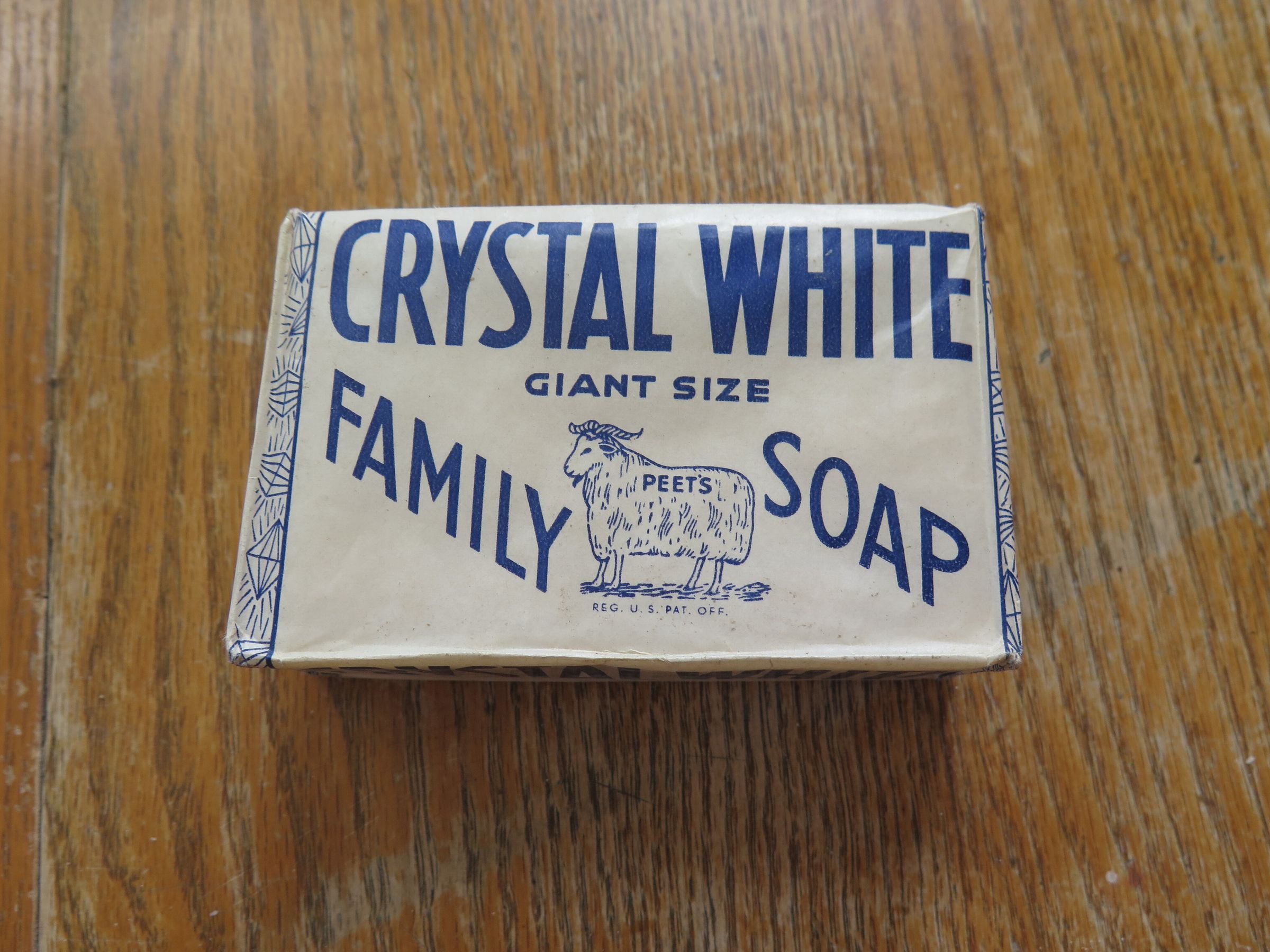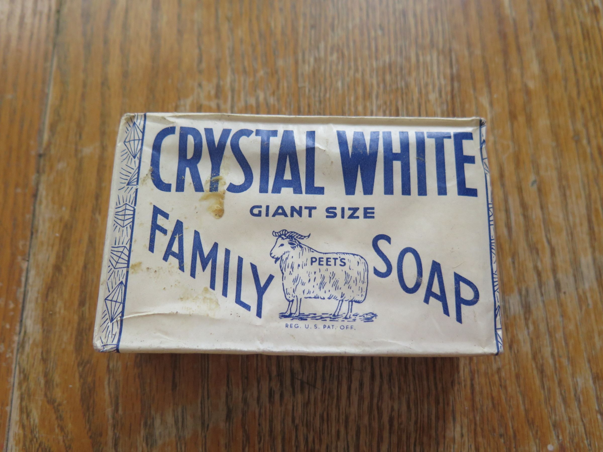 This is a bar of soap in white paper packaging with blue text reading; "Crystal White Giant Size Family Soap", around an image of a sheep. The sheep has the text "peets" written on it's back. The Crystal White brand was at it's most popular during the 1920s and was a bathing soap. The packaging measures 3" (w) x 4.5" (l).Collection