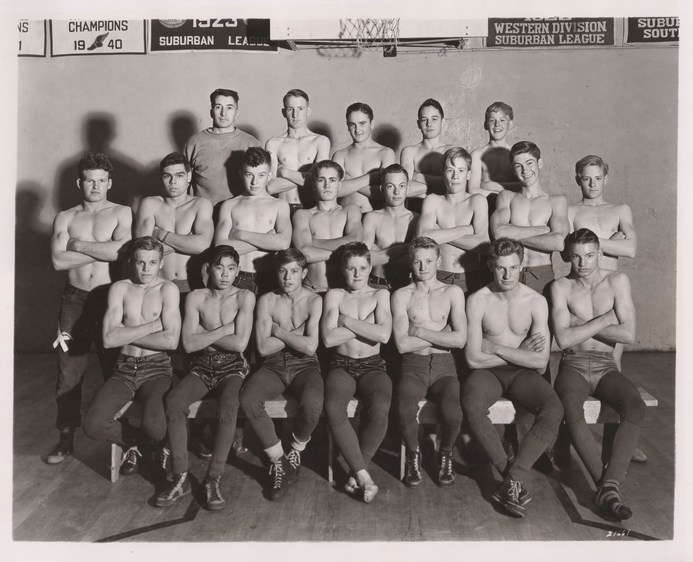 Likely the Arvada High School wrestling team, c. 1940. 19 boys sit shirtless with their arms crossed, coach likely the man in a sweatshirt top left.