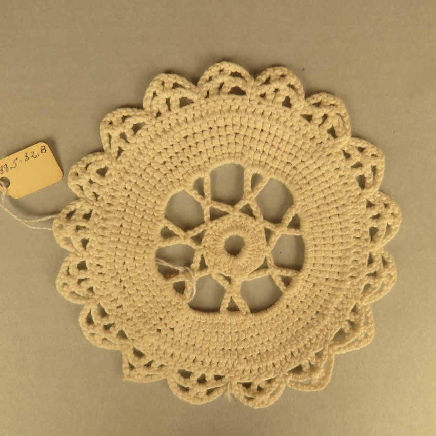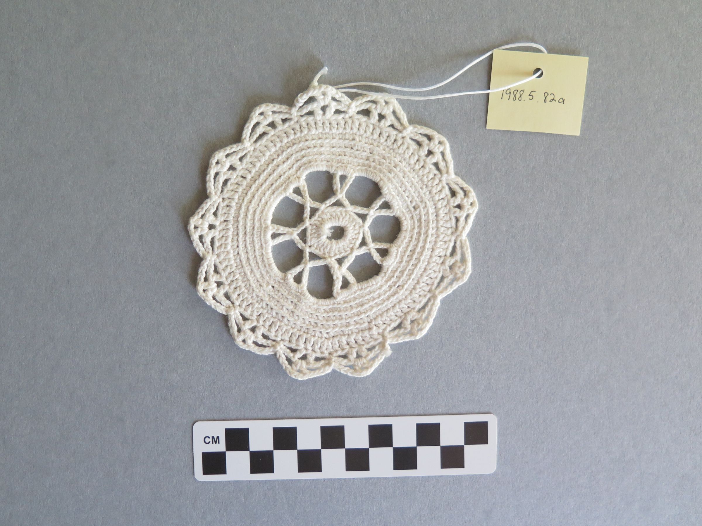 Off white crocheted doily, from set of 4 total (a-d). The doily measures 4.25" (diam).